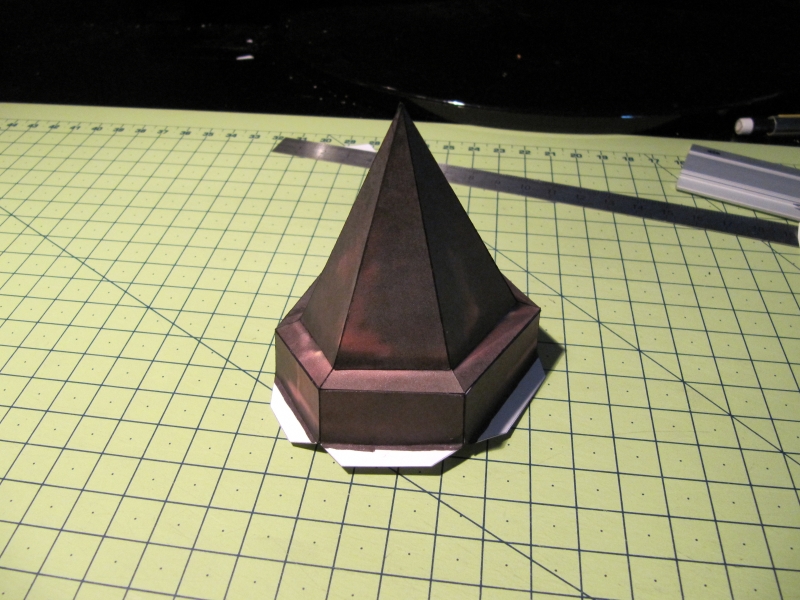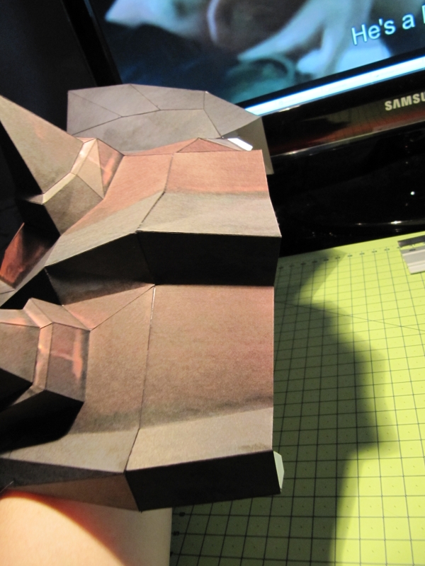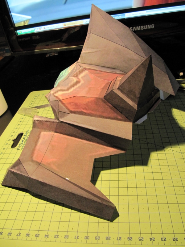 J'ai fini le casque en lui-même, mais j'ai raté lors du collage des 4 pointes sur le cache-visage. Alors je dois le refaire, mais j'ai plus d'encre dans mon imprimante pour le moment. Je dois prendre le temps de redimenssionner mes photos et vous les poster.