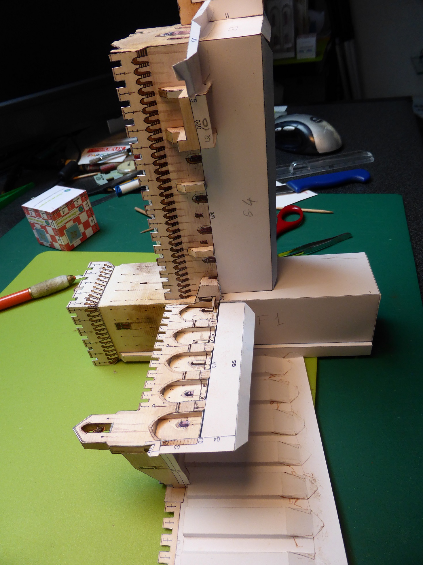 Oui Buzuc, les pièces en cours sont stockées un peu plus loin, au fond, et à venir, les planches du cloître :