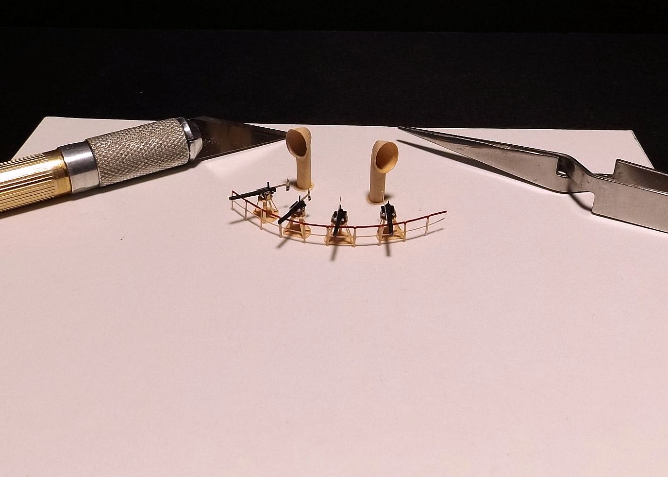Voici de nouvelles photos. Je suis reparti sur la superstructure arrière pour achever les dernières installations : quatre canons de 47 et deux manches à air, je pense que j'en ai terminé avec les canons de 47.