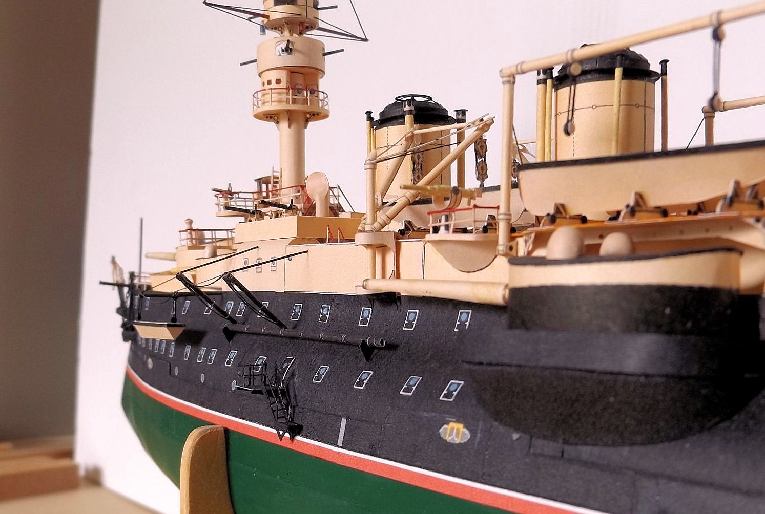 Les deux premières photos montrent le gréement terminé sur les deux mâts militaires. Même le gréement est confectionné à partir de fines lanières de papier!
