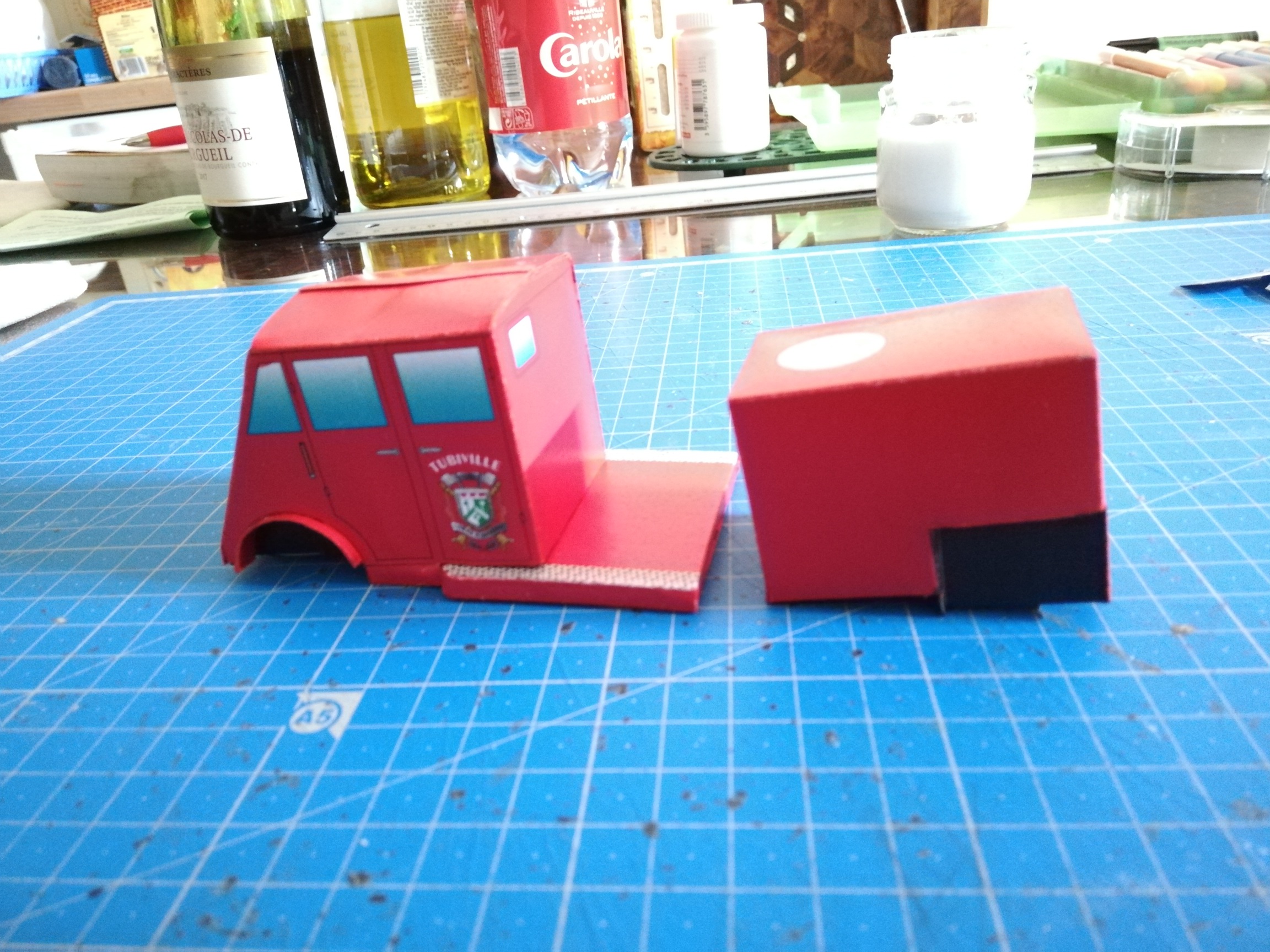 Bonjour à vous, le montage de celui-ci s'annonçant complexe (pour moi) et ayant sans doute pas mal de modifications avant qu'il soit réussi, j'ai commencé le montage du prototype et évidemment Pépère il s'est planté mais il continue quand même, le toit trop large, le passage de roues avant "à l'envers" et tout ça sans boire… si, si!