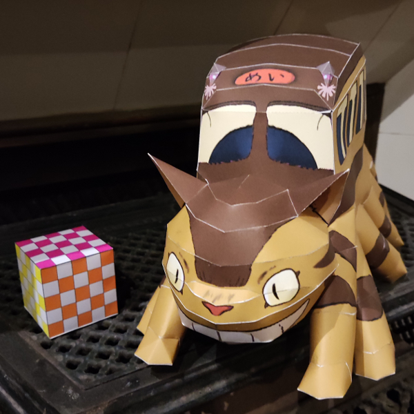J'ai reçu quelques pressions extérieures pour finir ma nouvelle maquette... La voila, les fans de Miyazaki reconnaitront le Chat-bus présent dans "mon voisin totoro". La tête et le corps n'ont posé aucune difficulté particulière, mais les pattes et surtout la fermeture du ventre ont été une bonne prise de tête !