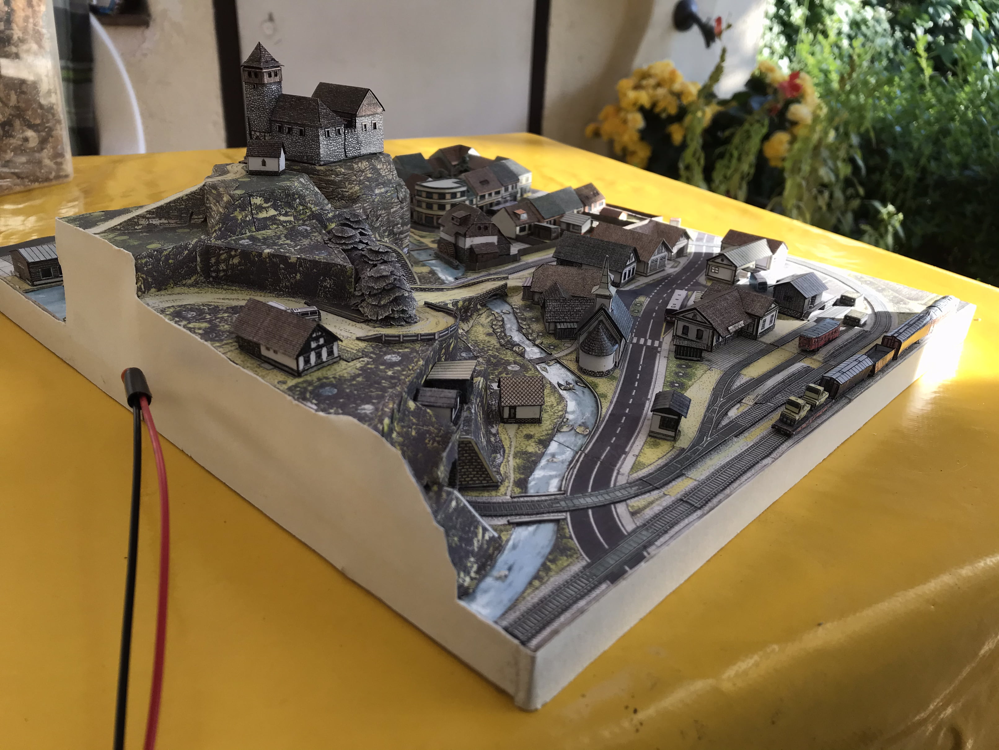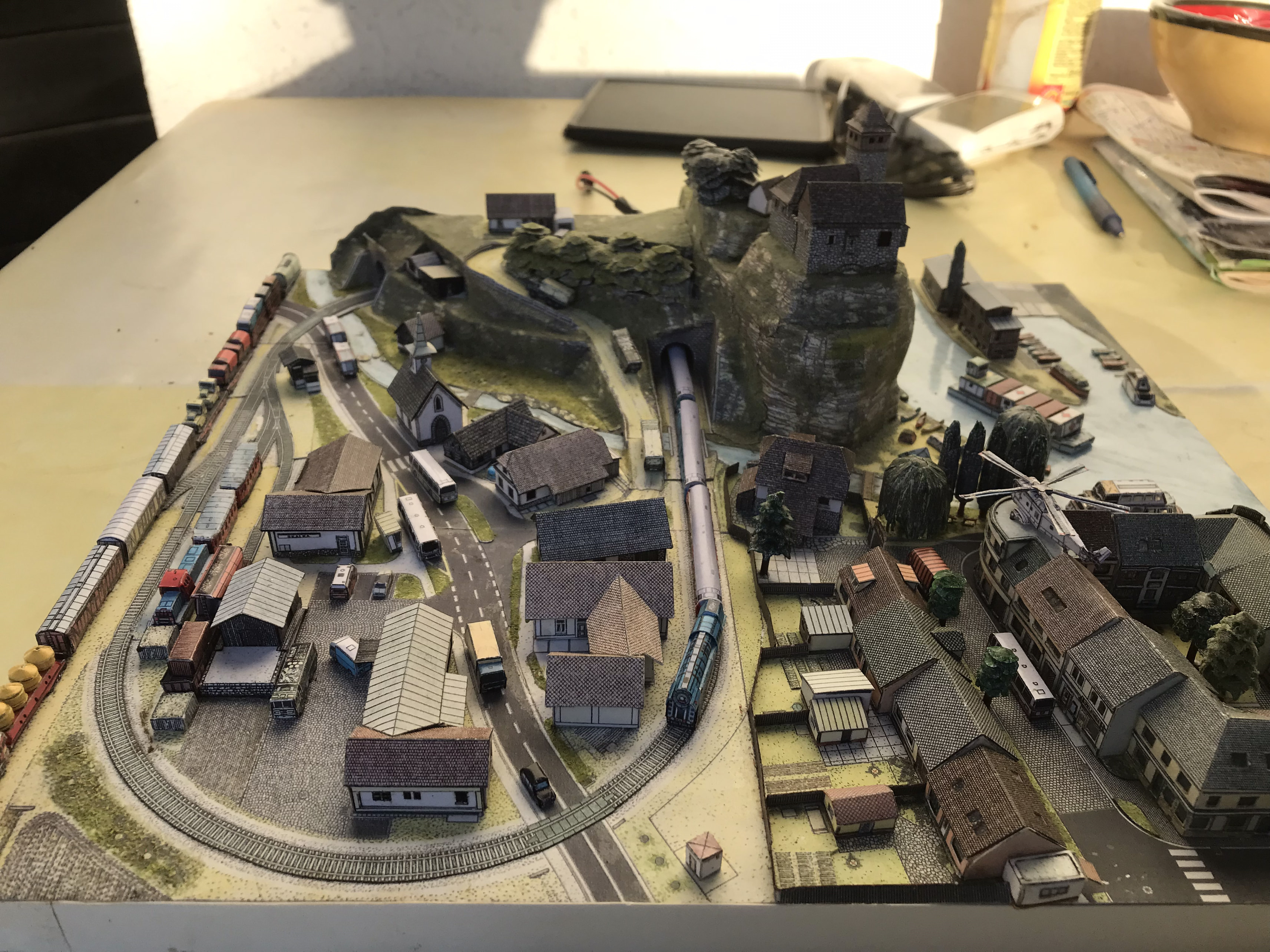 Oui et sans que cela prenne trop de place car un module fait 30 cm de coté. Si j avais fait cette ville au 1 -87, les dimensions seraient trop importantes ( 6 fois plus). Mais j ai encore loin,d avoir fini. J ai encore un gros travail de flocage . Mais comment faire sans perdre les détails du terrain . J ai peur que ça fasse moquette verte.
