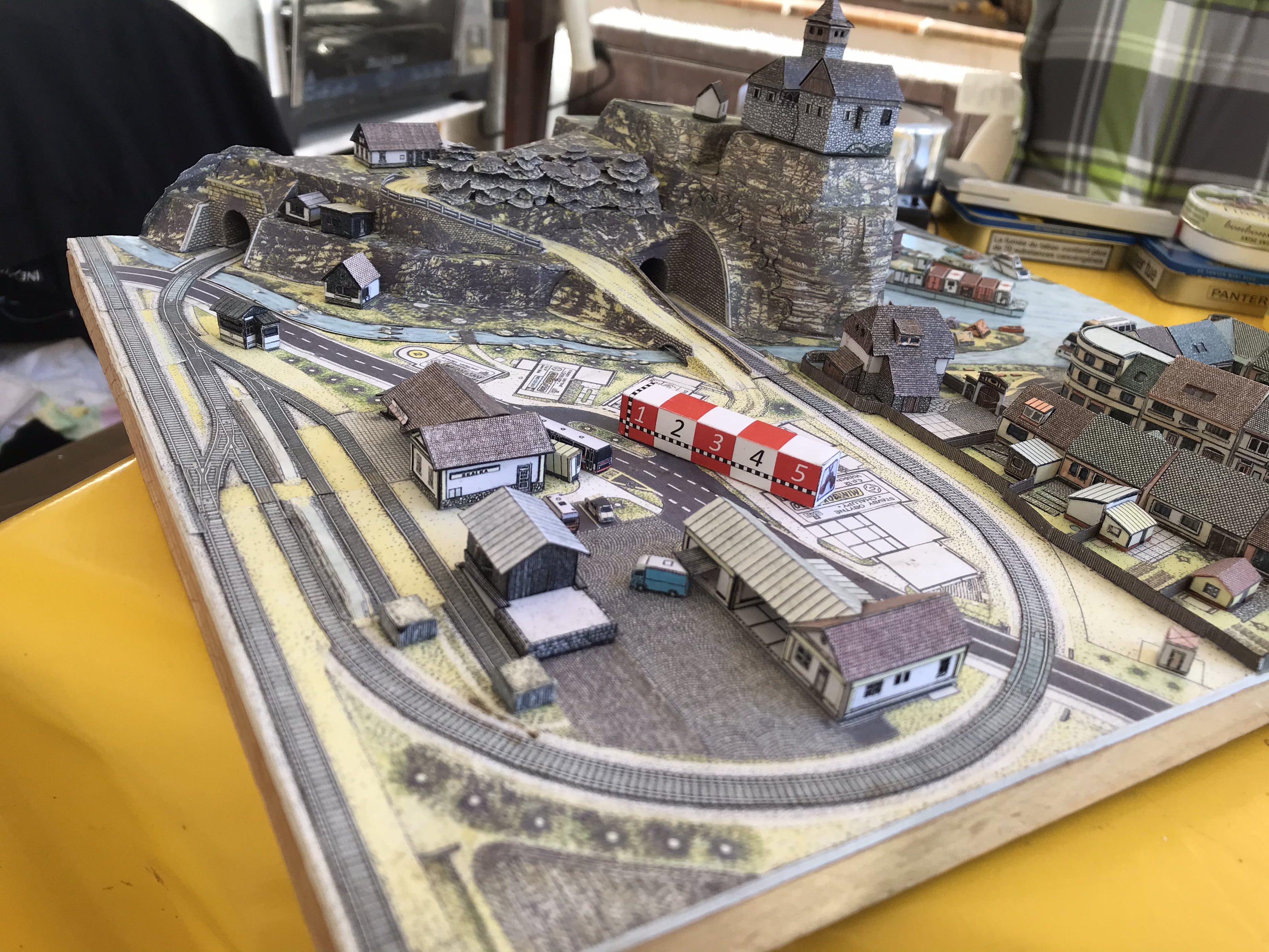 Oui et sans que cela prenne trop de place car un module fait 30 cm de coté. Si j avais fait cette ville au 1 -87, les dimensions seraient trop importantes ( 6 fois plus). Mais j ai encore loin,d avoir fini. J ai encore un gros travail de flocage . Mais comment faire sans perdre les détails du terrain . J ai peur que ça fasse moquette verte.