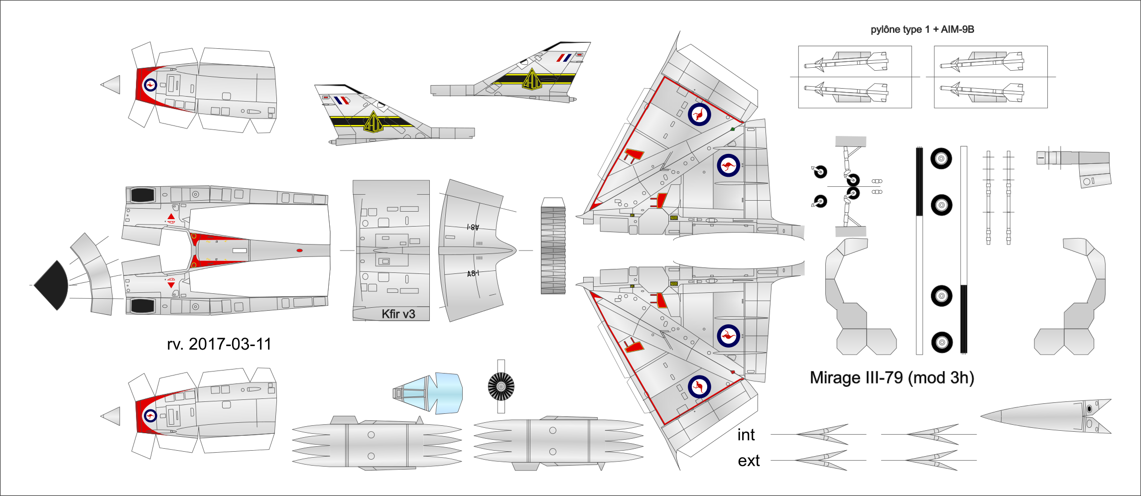 Les Mirage III+, hybride de Mirage III et de Kfir, basés sur une idée de GTX et des profils de Christopher Cooper pour le forum www.whatifmodellers.com, postés il y a 11 ans déjà ! Le biplace est nouveau de ce soir et n'existait pas en profil. Le proto non plus d'ailleurs, ou plutôt seulement en version non coloriée et avec la bosse du radar doppler du IIIE.