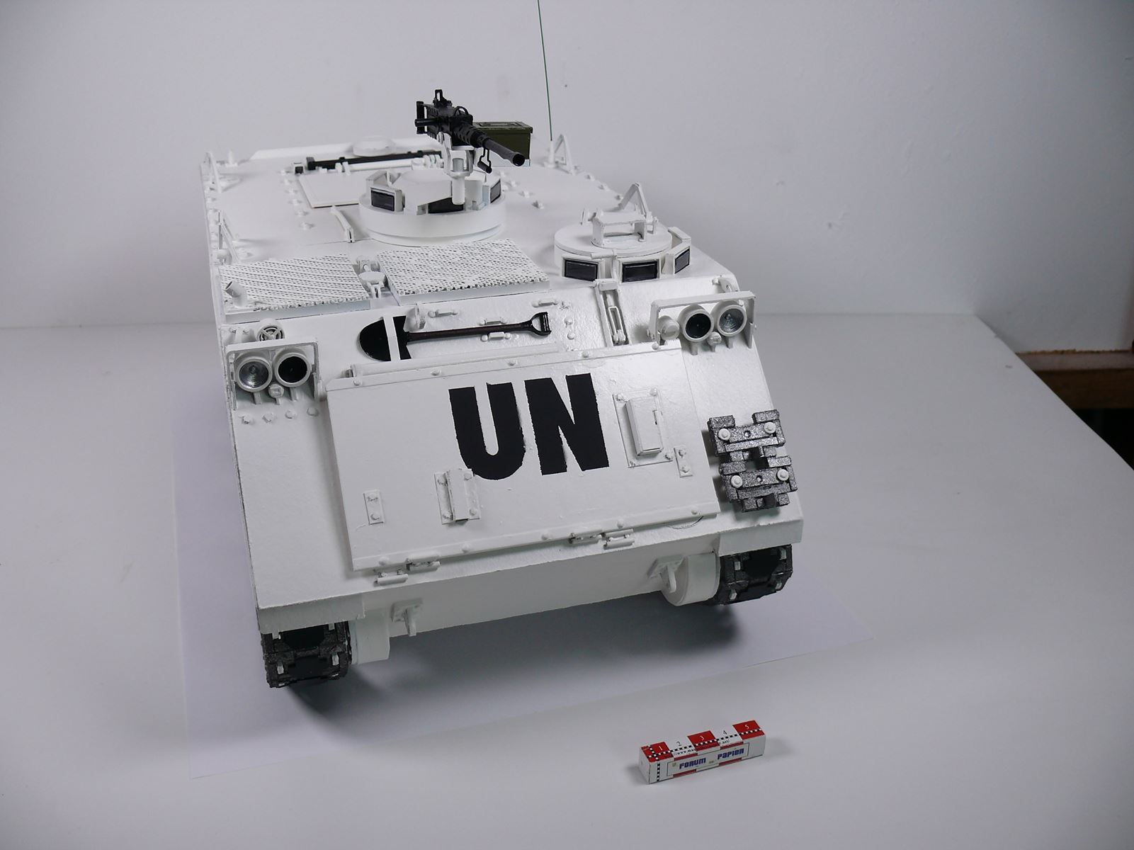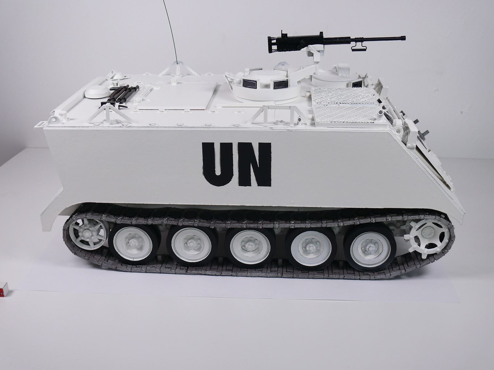 N'ayant qu'une confiance limitée sur la tenue dans le temps d'un angle formé par un morceau de carton simplement plié et jugeant la confection de la protection de la coupole au delà de mes capacités, je me suis rabattu sur un M113 du début du conflit équipé d'une mitrailleuse M2 sans protection et d'un canon sans recul M40a1. Ce qui donne ceci : A suivre...