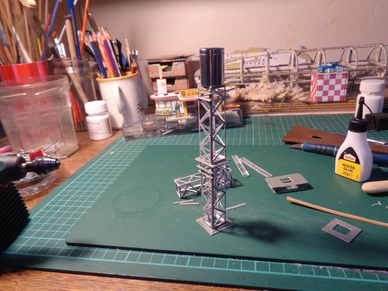 Le premier étage est collé, les pièces qui se montent sur lui sont doublées, comme le pied et les plateformes intermédiaires