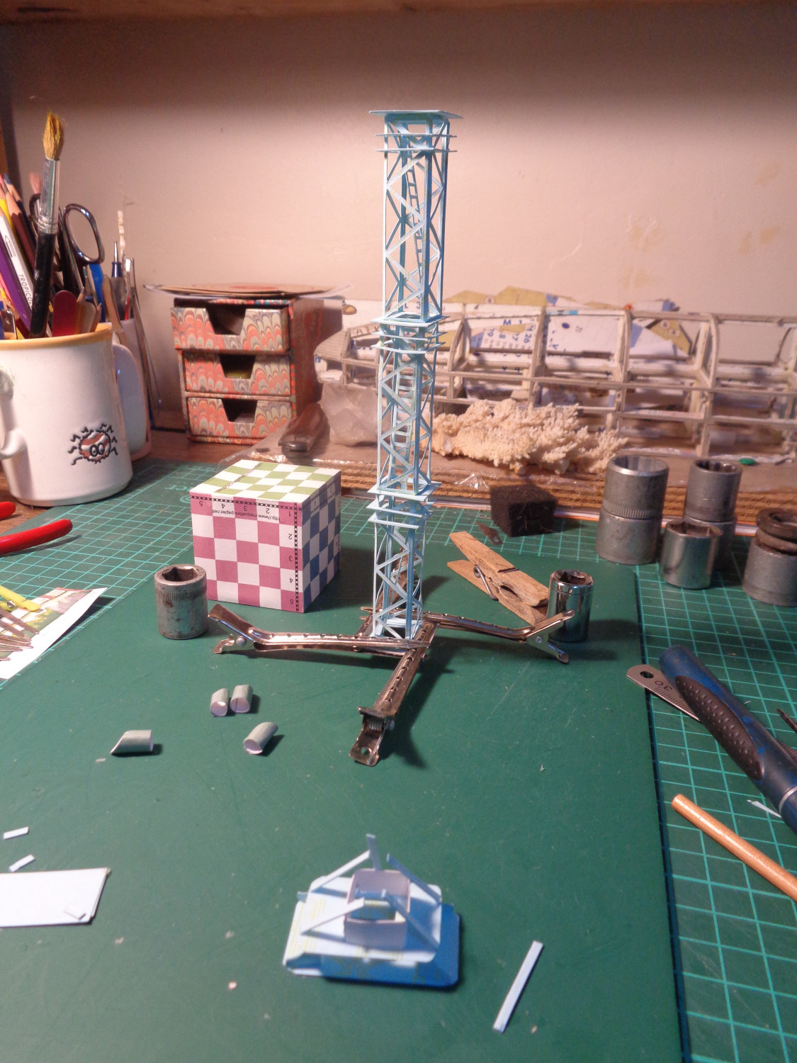Après le premier pylône, installé et qui porte ses projecteurs, j'ai essayé d'en faire un autre plus fin en partant d'une feuille en couleur de 160g, deux fois plus fine que la précédente. J'en ai profité pour améliorer le dessin et un ou deux détails. Le papier est un "papier cartonné de couleur" sans marque mais avec beaucoup d'allemand sur la première feuille.