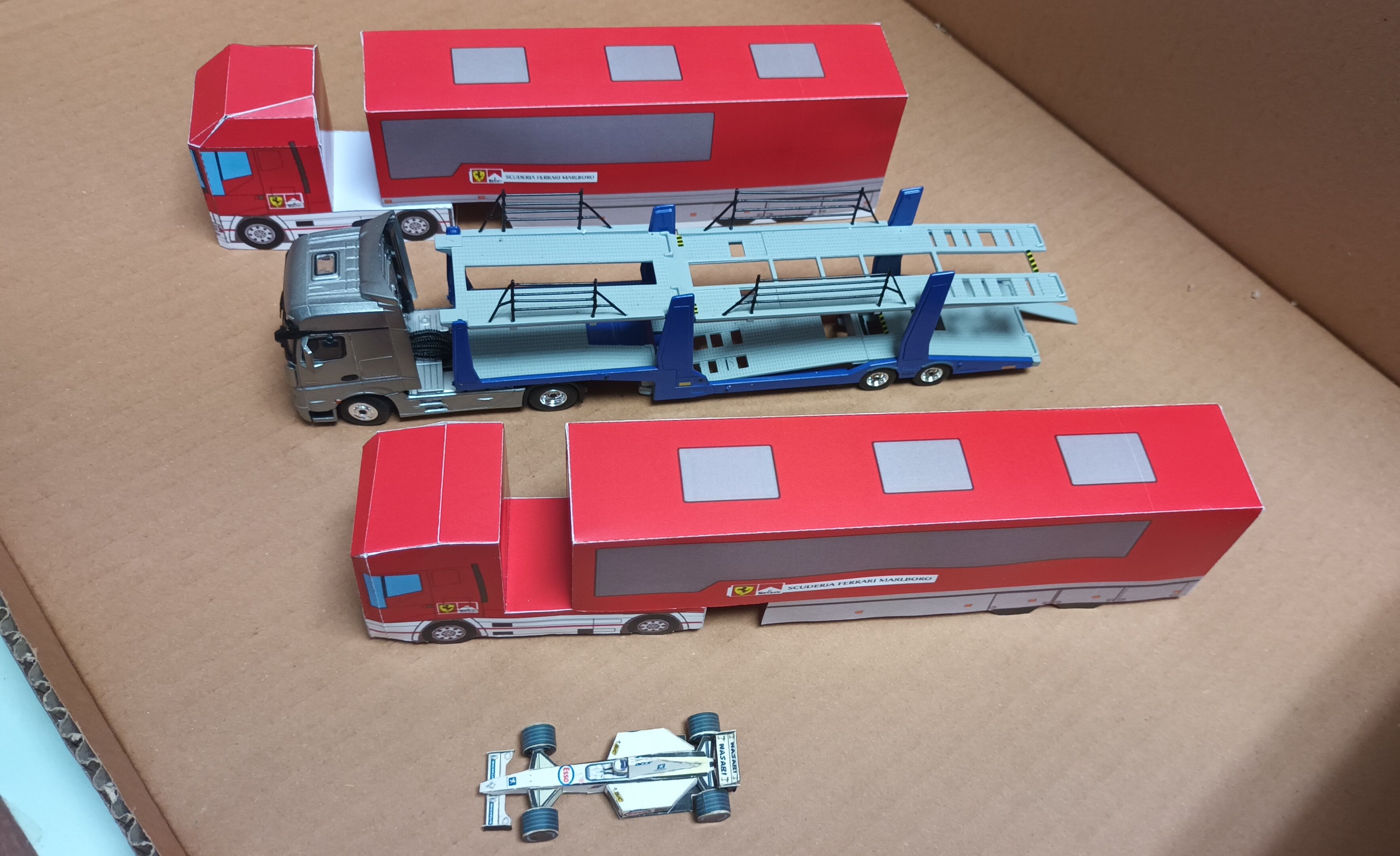 (au milieu, c'est le 'Mercedes-Benz Actros w/ Car Carrier trailer de MINI GT' reference 111, qui m'a coute une fortune!!!)