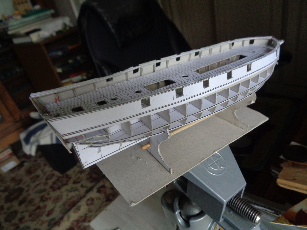 la proue et on voit la tonture du pont, imposée par les couples. J'ai fait un support provisoire qui me servira pendant toute la construction. Je verrai à la fin si je le garde ou si j'en fais un plus élégant.