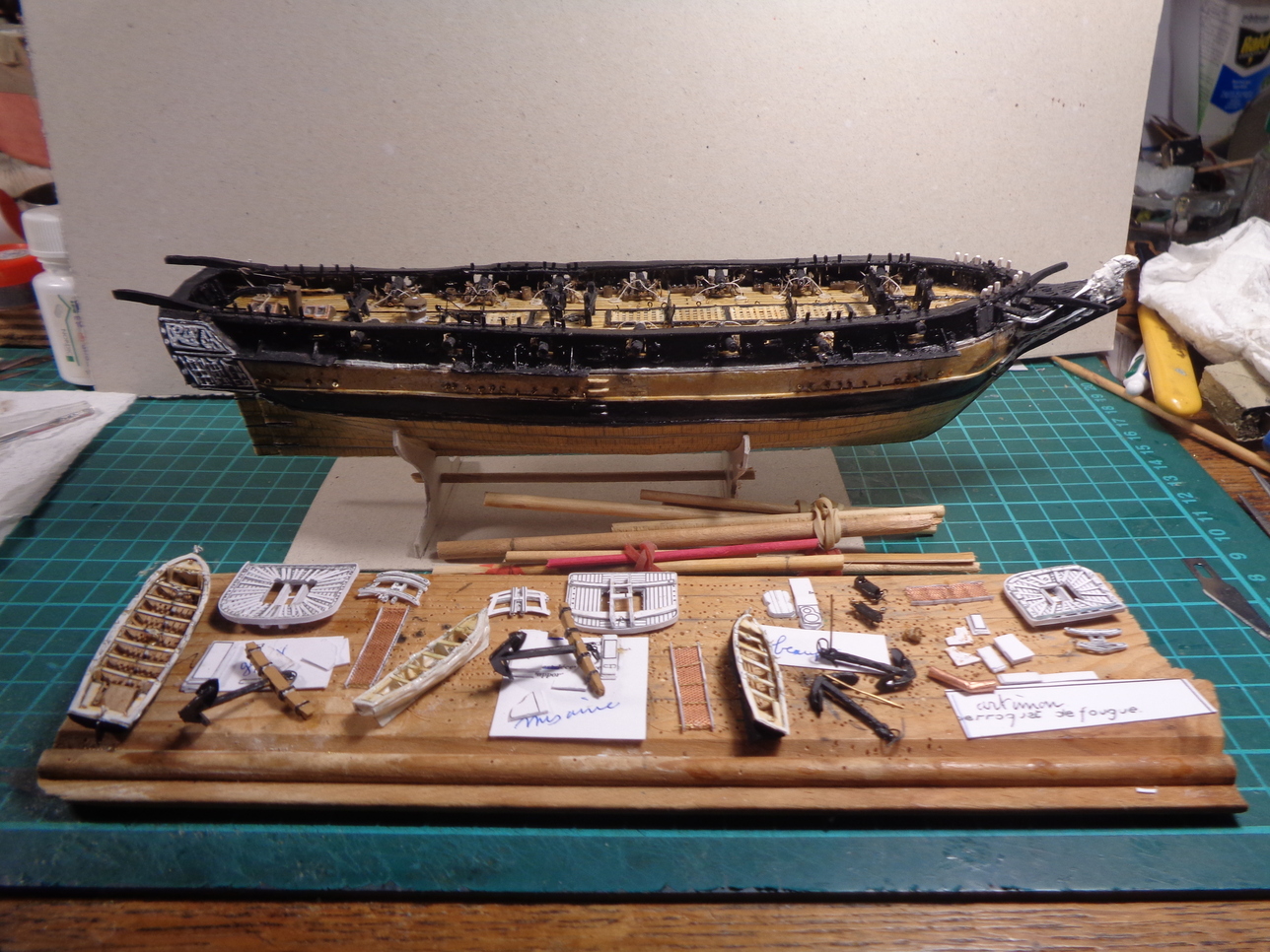 et voilà avec la dernière et énorme erreur. les bossoirs d'embarcation doivent être à gauche de la herpe supérieure, le premier sabord doit être légèrement plus loin en arrière et tout est trop gros, y compris le test des cabillots blancs! Et pourtant c'est déjà joli... Mais on va poursuivre... Et faire mieux!