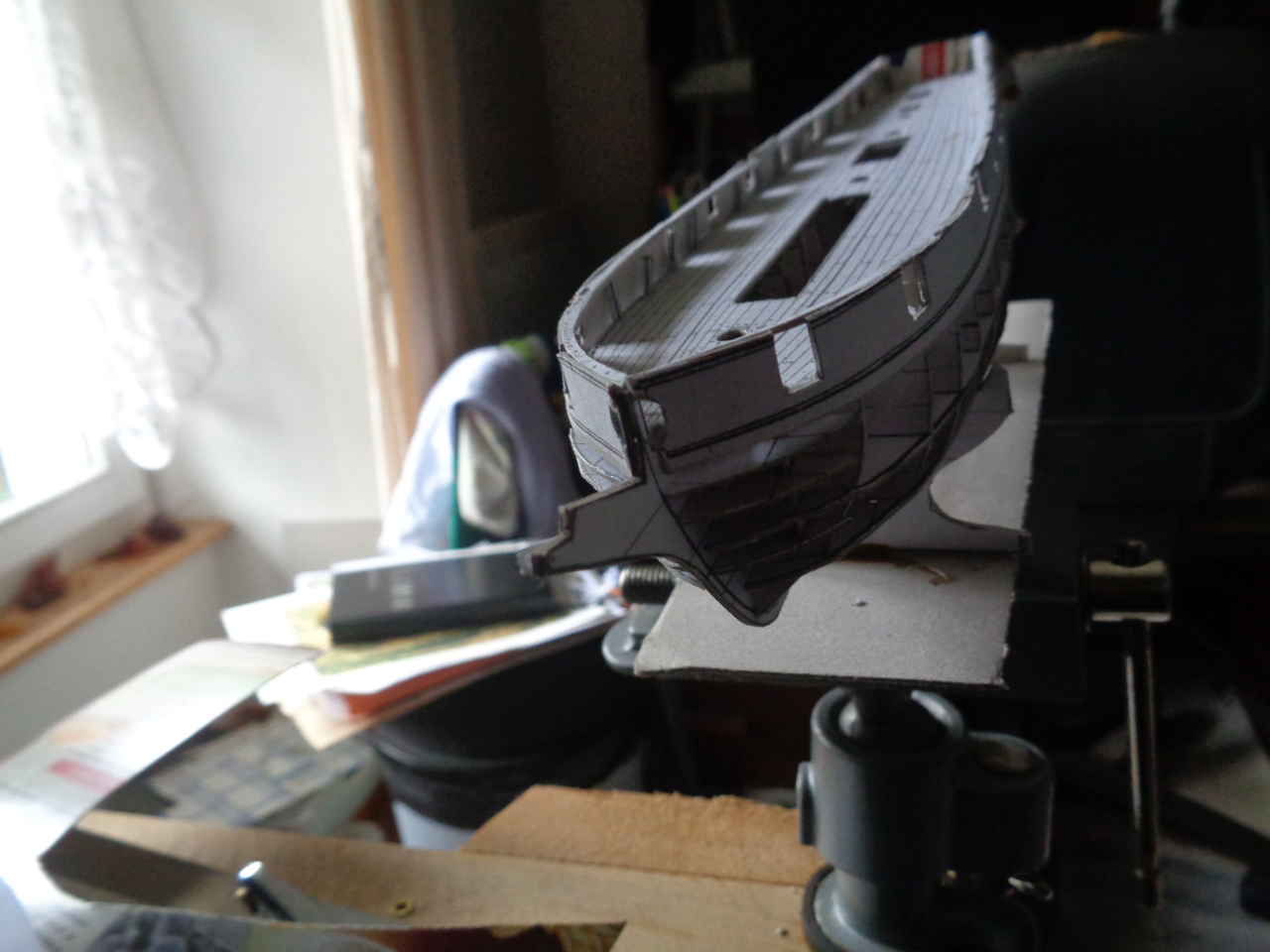 Je vais passer à la poupe et à la proue dans les messages suivants. La décoration de la coque n'interviendra qu'une fois qu'elle sera complétée. Un peu après ce stade, j'avais posé des tas d'anneaux, en fait, on peut attendre. On verra avec les canons par exemple, qu'il est bien plus simple de ne mettre les anneaux de fixation qu'au moment de poser les canons. Essayer de les câbler sur des anneaux préexistants est quasiment impossible .
