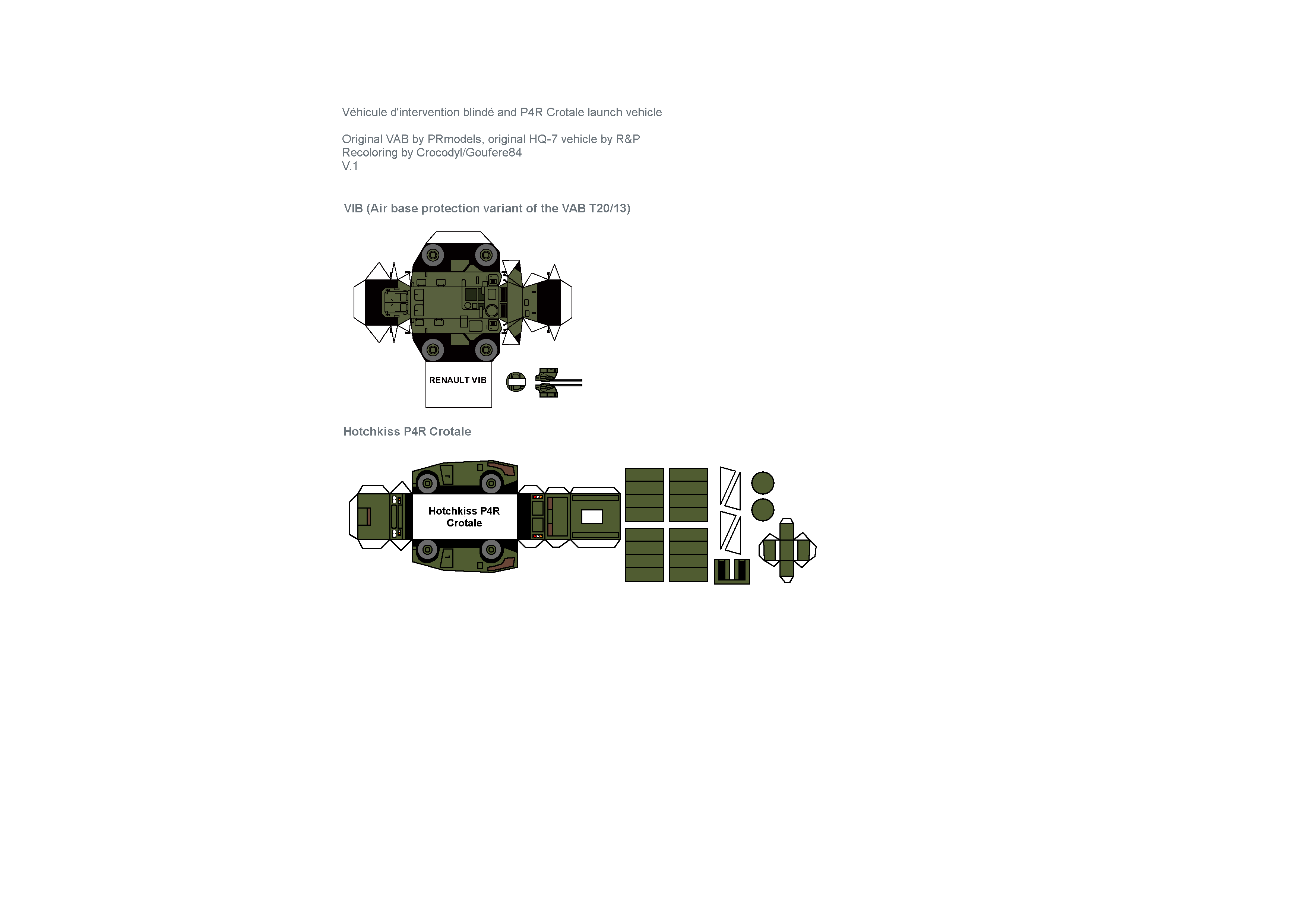 Avec le VIB, le Hotchkiss P4R en version lanceur de Crotale (à ne pas confondre avec le Peugeot P4, qui aura un jour son kitbash repaint dans sa version ASPIC lance missile Mistral). Ce drôle de véhicule, à transmission hybride électrique, a été copié avec ses missiles par l'industrie de l'armement chinoise en la matière du HQ-7.