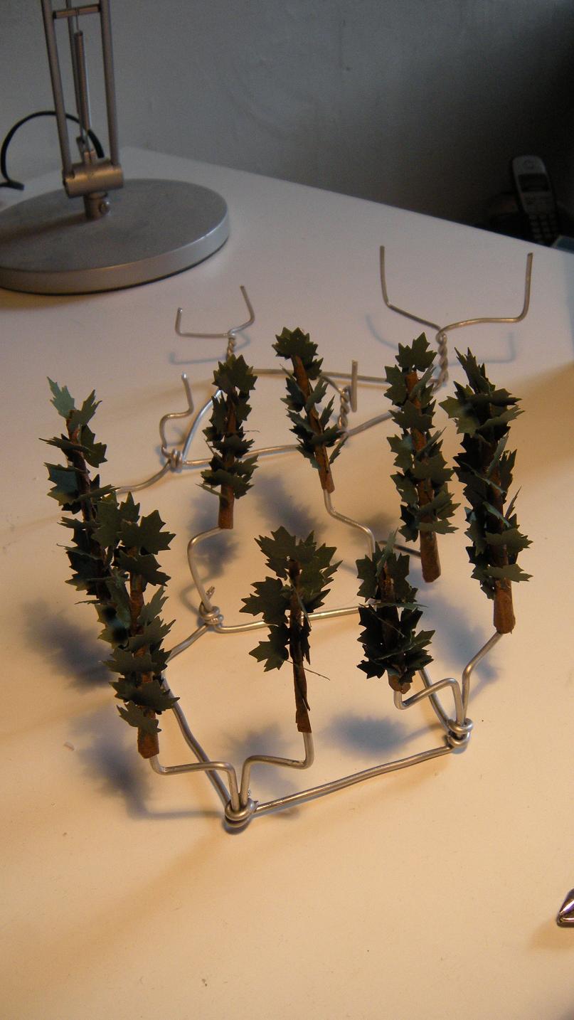 Alors après réflexion une technique qui en vaut une autre pour faire un arbre. D’abor le tronc et les branche maitresses. Tu fais des tubes de différent diamètre et longueur en fonction de l’échelle de ta maquette tu les colle en te basant bien sur une photo de l’arbre que tu veux reproduire, une fois bien sec tu emploi du papier japonais ou autre en tout les cas un papier extra fin que tu applique su l’âme de ton futur arbre préalablement enduit de colle. Ne pas chercher a bien le tendre au contraire il faut qu’ cela fasse des plis dans le sens vertical pour donner l’aspect de l’écorce peinture puis vienne ensuite les feuilles une perforatrice en forme de feuilles que tu utilise sur avec du papier de différent vert brun etc. tu les colles une par une et voilà un arbre super sympa C’est la technique que j’employait pour faire mes décors de théâtres et de cinéma ; si j’ai le temps je te fait un model que je posterai