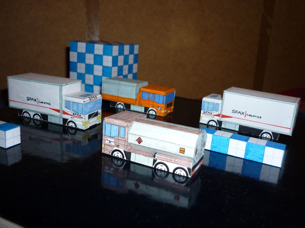 On passe maintenant aux modèles perso. J'ai commencé à faire des jouets en papiers vers l'âge de 9/10 ans et ils ont commencé à prendre un peu de volume quand j'avais 13 ans (ils étaient plutôt plats avant). Il s'agissait de remplacer les jouets que mes parents ne m'achetaient pas. Ils sont donc très simples, fait pour être dessinés rapidement sur du papier quadrillé et construits tout aussi vite. J'évitais les surfaces courbes et mes voitures, camions et bus n'avaient pas de roues complètes (et n'en ont toujours pas). Je crois bien que ma première doc a été le catalogue des miniatures Siku de 1985.