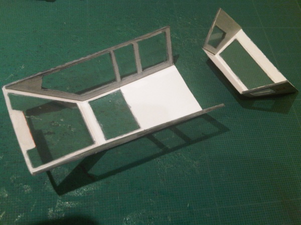 Les différentes pièces ainsi que les vitres et les renforts: Collage des vitres sur les renforts: Collage des renforts et des autres vitres: Le résultat: Et essai à blanc sur le cockpit
