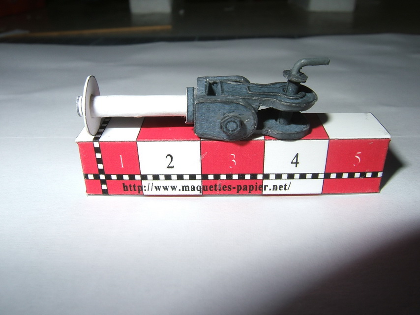 Après avoir trouvé une photo du treuil du Famo (le vrais :D ) je l'ai modifié en ajoutant cette barre de protection sur l'entrainement, puis j'ai remonté le support de celle d'origine ( en ajoutant une console en dessous)et j'ai installé un autre support, à l'avant du treuil comme sur le vrai. Avec la dernière barre fixée sur le chassis, en cas de rupture du cable, la protection des éléments périphériques devait être bien assurée.