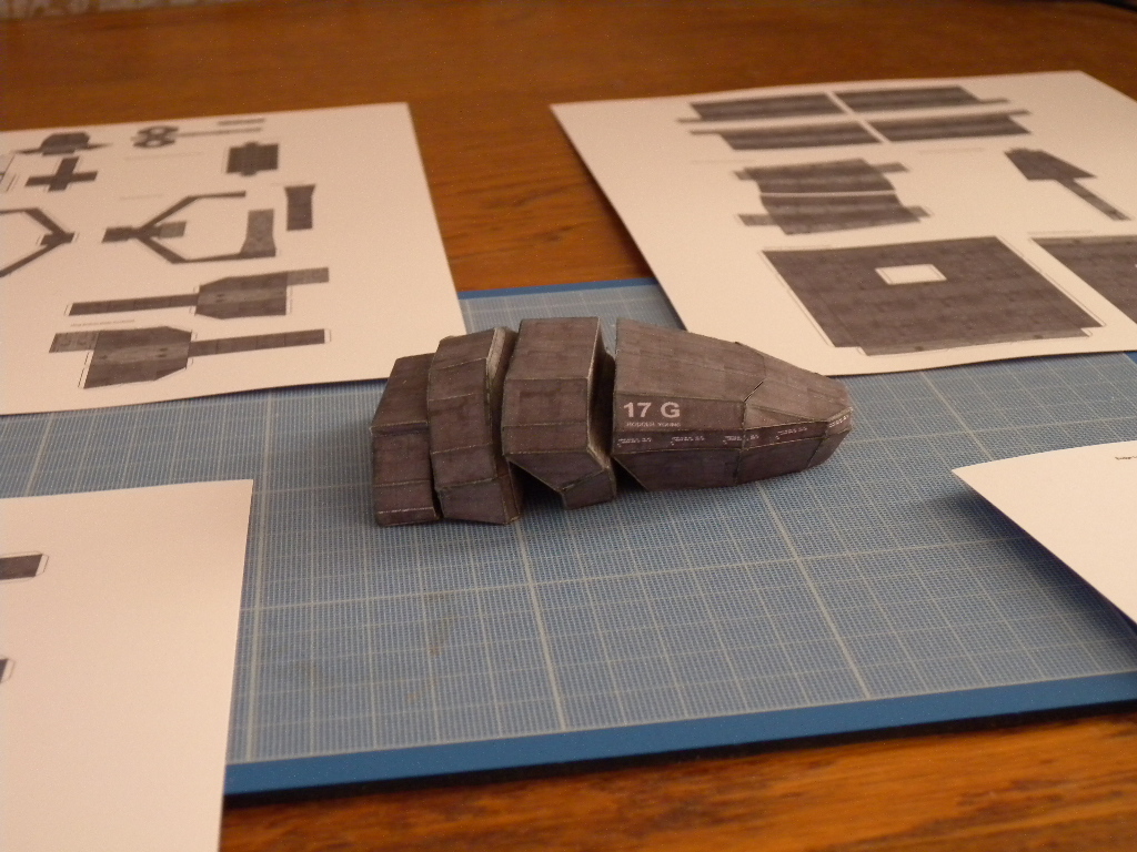 J'arrive assez rapidement à quelques pièces me permettant de concrétiser un début de l'avant du vaisseau. A cause des nombreuses lignes de pliage, le feutre est à utiliser sans modération