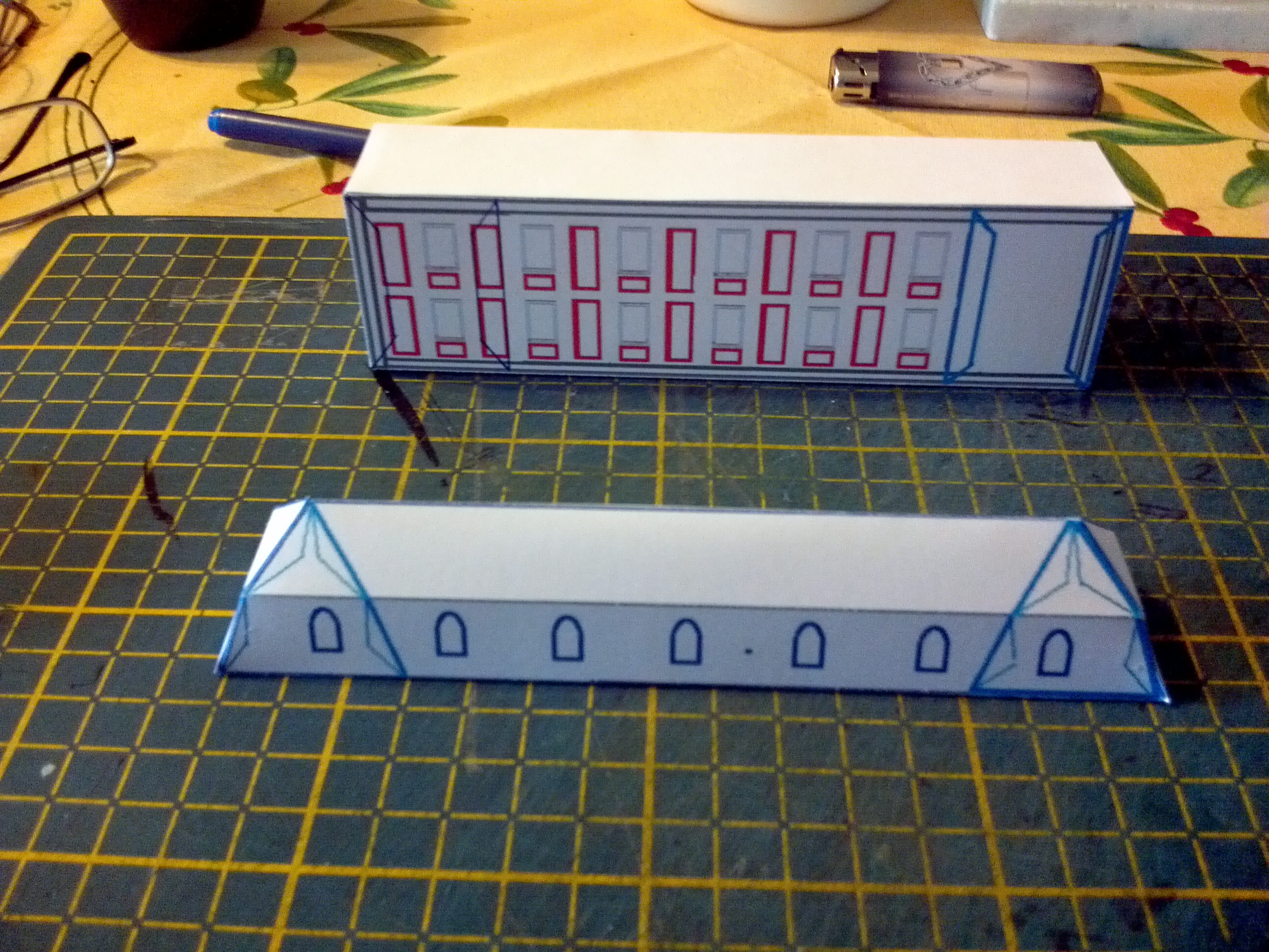 pour économiser papier, encre et nerfs, j'ai dessiné des gabarits des batiments, que j'habillerai une fois les tests de montage terminés ;