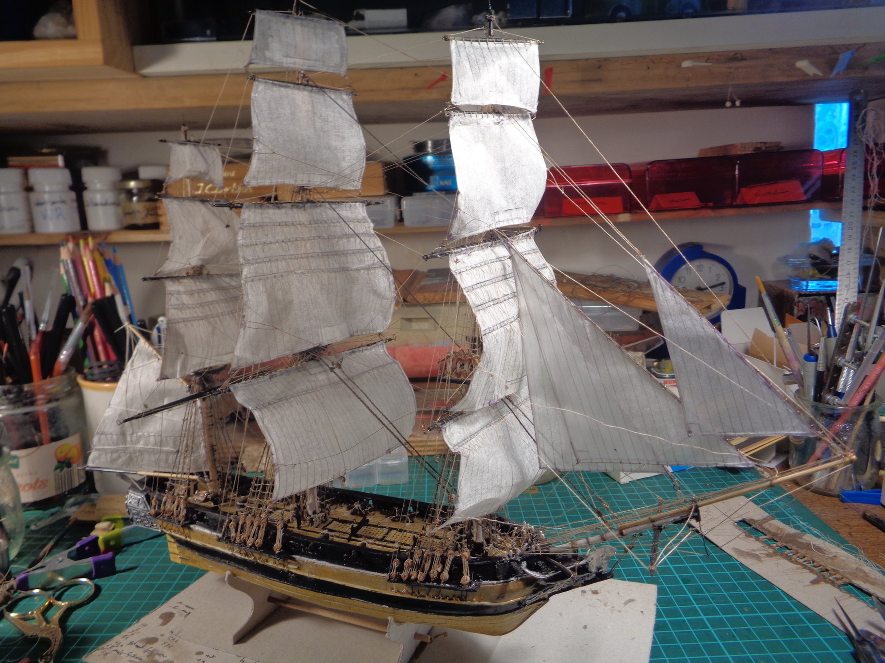 Grosse avancée depuis la dernière fois. J'ai pu "ranger" les cordages des trois mâts, j'en suis au beaupré. Encore un jour ou deux et je pourrai passer à la finition....