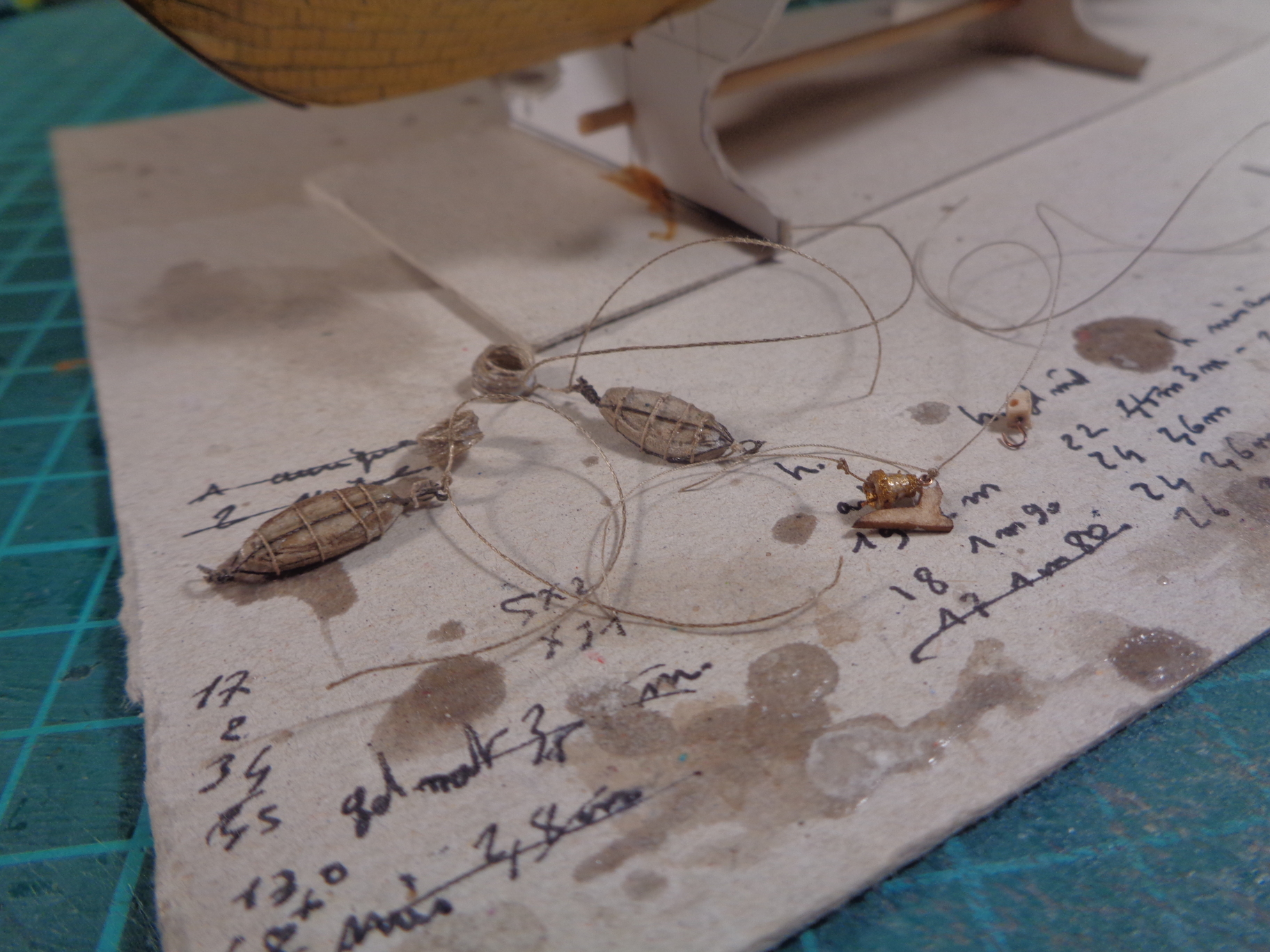 Il y a aussi quelques petits grappins qui seront peints en noir avec un rouleau de cordage. On trouvait d'autres choses comme un tonneau à eau, un compas mais qui ne restaient pas dans les barques.