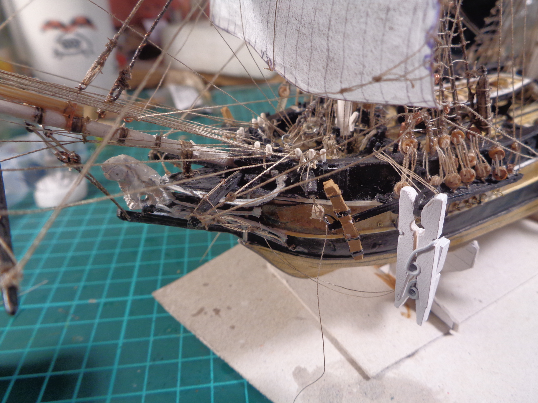 Et voici la bouée de sauvetage en place et la yole du capitaine en place sous ses bossoirs. Elle devrait être amarrée en plus par des sangles qui la maintiendraient contre la coque et couverte pour qu'elle ne se remplisse pas d'eau. Mais je la laisse ouverte pour qu'on puisse mieux la voir. Les pinces à linge miniatures servent à maintenir une certaine tension dans les cordages pour que leur courbe devienne plus "naturelle"