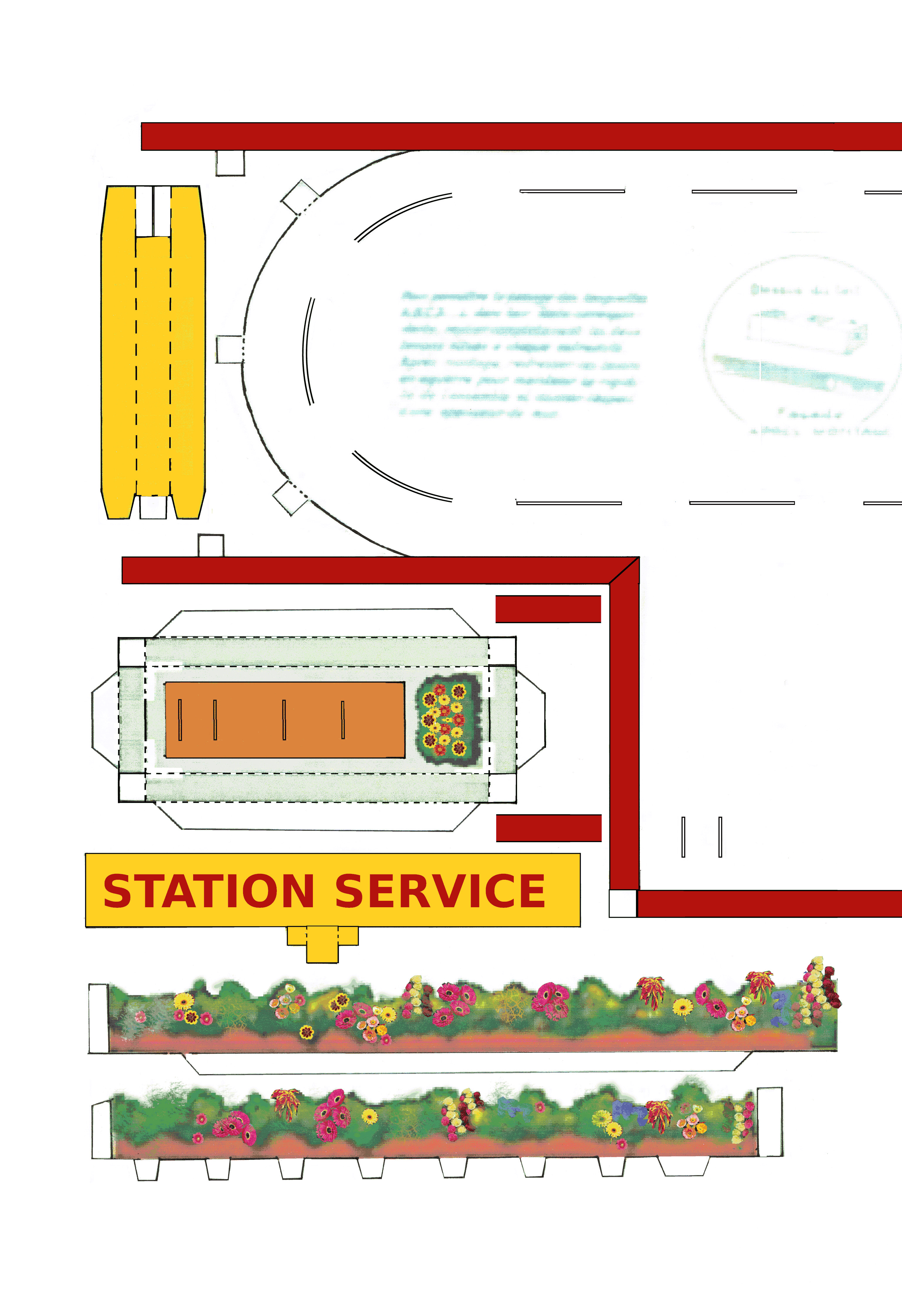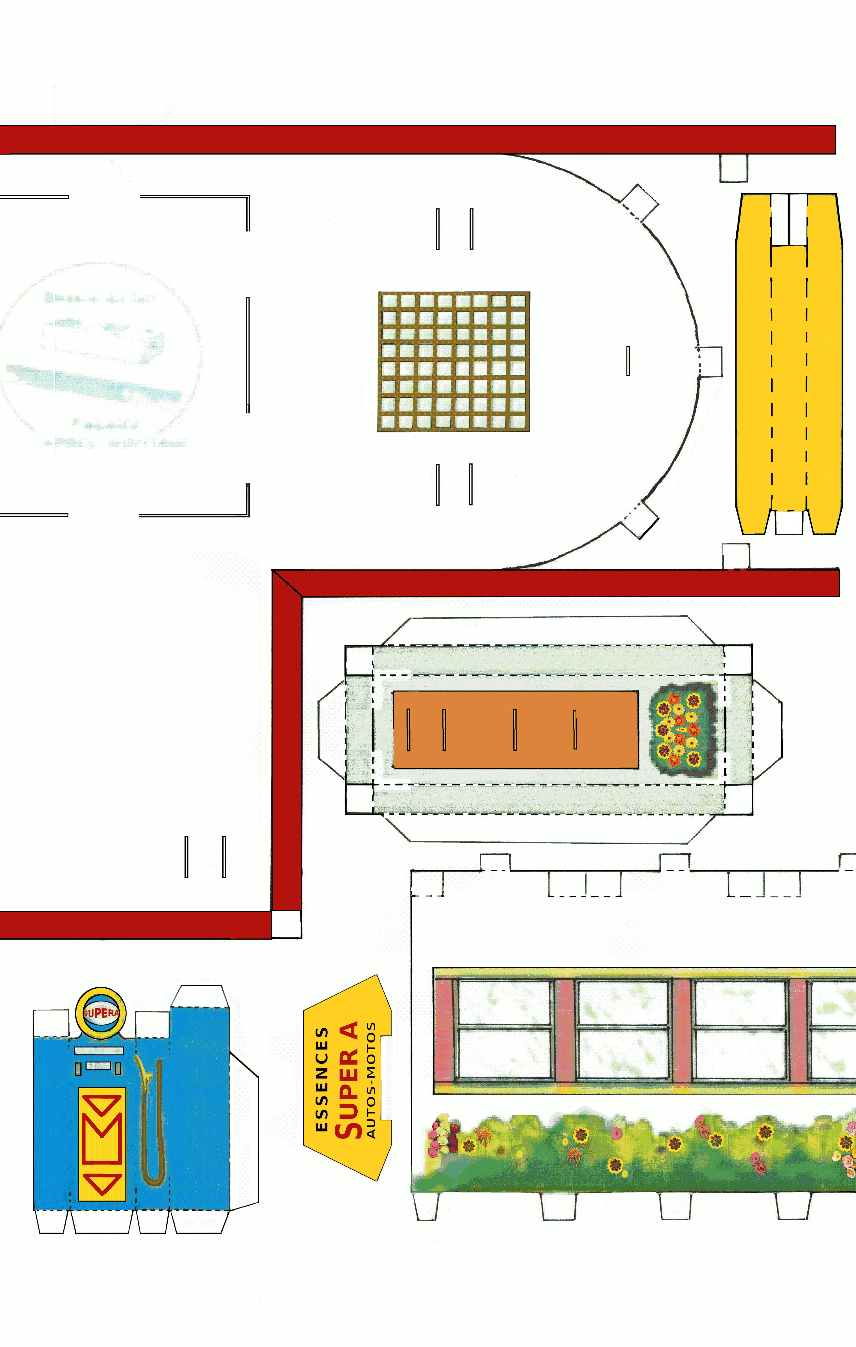 J'ai changé l'heure des horloges et les publicités, l'original étant bien trop mauvais. J'ai mis des fleurs d'un catalogue de fleuriste et je vais construire un modèle réduit en A3 dans quelques jours. De même, les indications de la borne Michelin sont fantaisistes. Les couleurs sont "dans l'esprit" de l'original que je n'avais jamais vu avant que vous mettiez les images sur le forum.