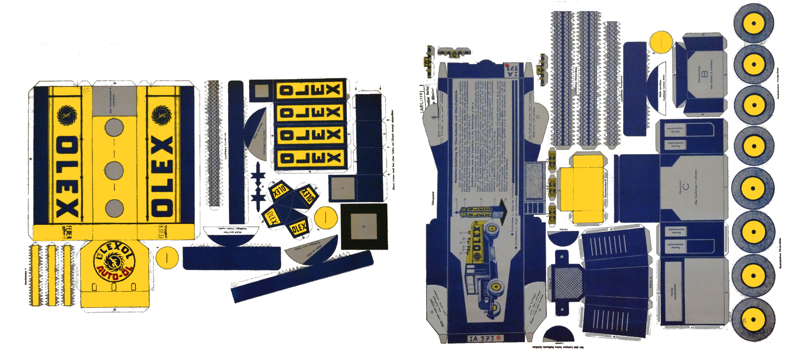 Voici les planches du camion Olex nettoyées. On voit qu'il y a beaucoup à redessiner, mais telle quelle, on peut en tirer un petit modèle. J'ai respecté les indications sur la taille de la feuille blanche et effectivement, le raccord entre la citerne et le châssis paraissent bons. Voici mon tirage sur une feuille A4 de 160 grammes.