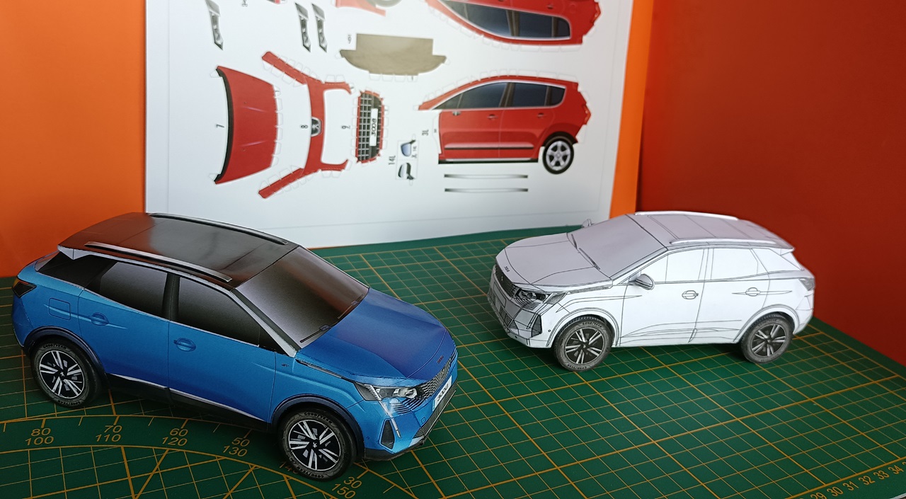 J'ai reçu un ensemble complet de balayages 3008 en couleur. J'ai aimé la couleur choisie par l'auteur. Une instruction de construction a également été ajoutée. Concise, mais les faits saillants sont visibles. J'ai imprimé deux ensembles. L'un avec l'intérieur, l'autre sans. J'ai d'abord décidé d'assembler sans intérieur. Et immédiatement trouvé deux erreurs. Une coupe incorrecte et aucune valve de collage.