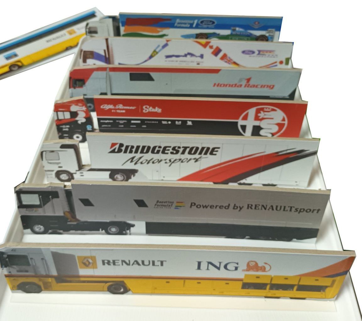 Des camions motorhomes F1 en 2D a l'echelle 1/64eme en vue de creer des arriere-plans sympathiques pour mes petites F1 en papier ou en zamac