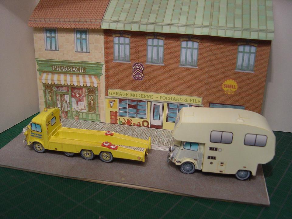 Une base imposée, un modèle de Camille, redécoupé en "vitrine", pour y loger la Voisin Laboratoire de Pierreg, et en bricolant le camping car 6 roues, toujours de Camille, pour en faire une remorque pour présenter le Rosalie d'Amigamaquette !