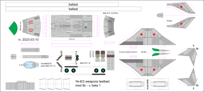 Le 8ème MiG-21 de série (qui n'avait pas été terminé) est devenu le second prototype (Ye-6/2) après un chantier de conversion. Il reçut un moteur plus puissant (R-11F-300 qui allait être conservé pour les MiG-21F et F-13 de série), les ailes ont été modifiées pour accepter un pylone permettant l'emport d'armement air sol et 2 des 3 paires de cloisons alaires ont été supprimées, ne laissant que celles près des saumons de voilures (et que je n'ai jamais représentées sur les autres versions alors qu'elles sont toujours là). L'un des 3 canons du Ye-5 est supprimé. Des entrées d'air auxiliaires apparaissent sur le nez. Le Ye-6/2 fait son 1er vol le 15 septembre 1958 et est redéployé sur la base d'Armyak au Turkménistan en novembre pour la suite des essais.