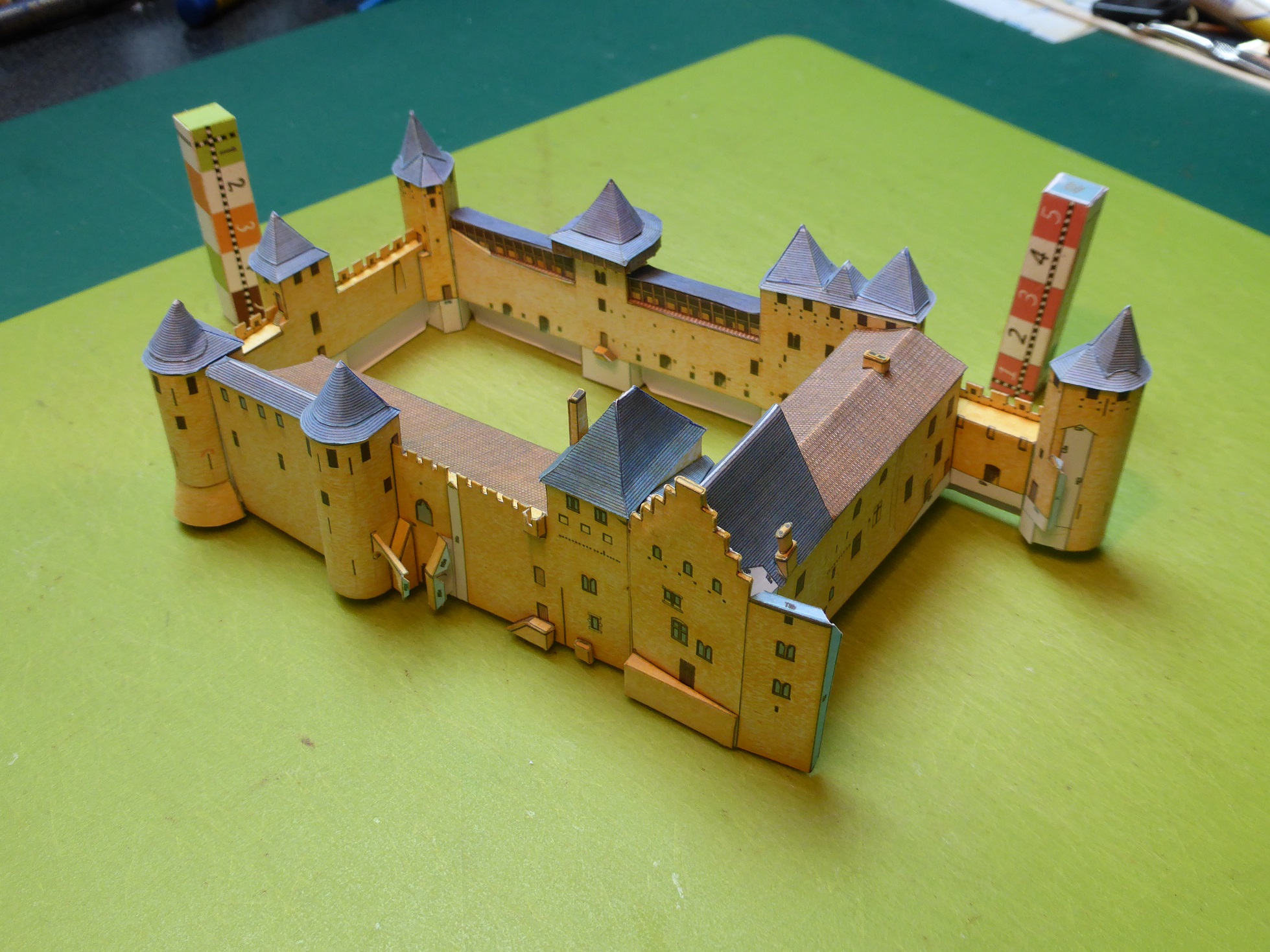 Le modèle Carcassonne, réduit en imprimant sur des feuilles A6 après scans. Ce qui fait une échelle d'environ 1/540°.