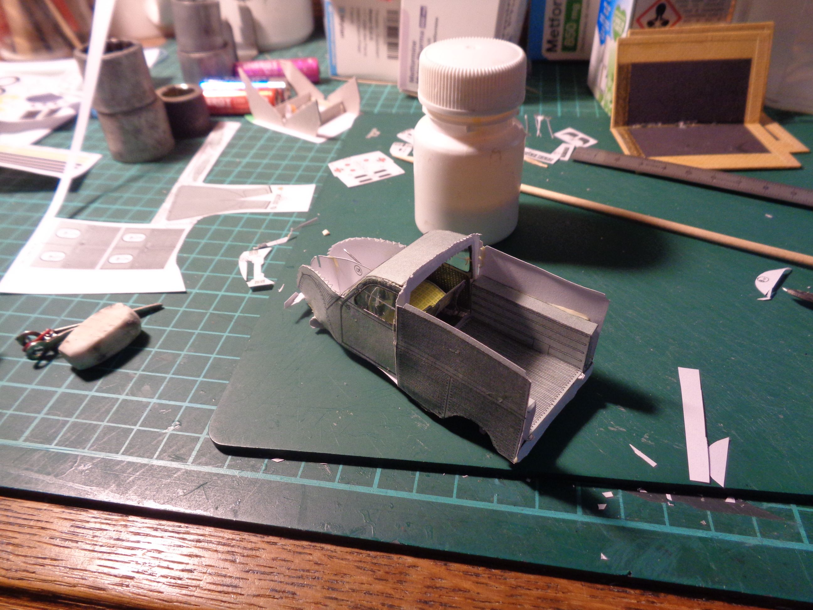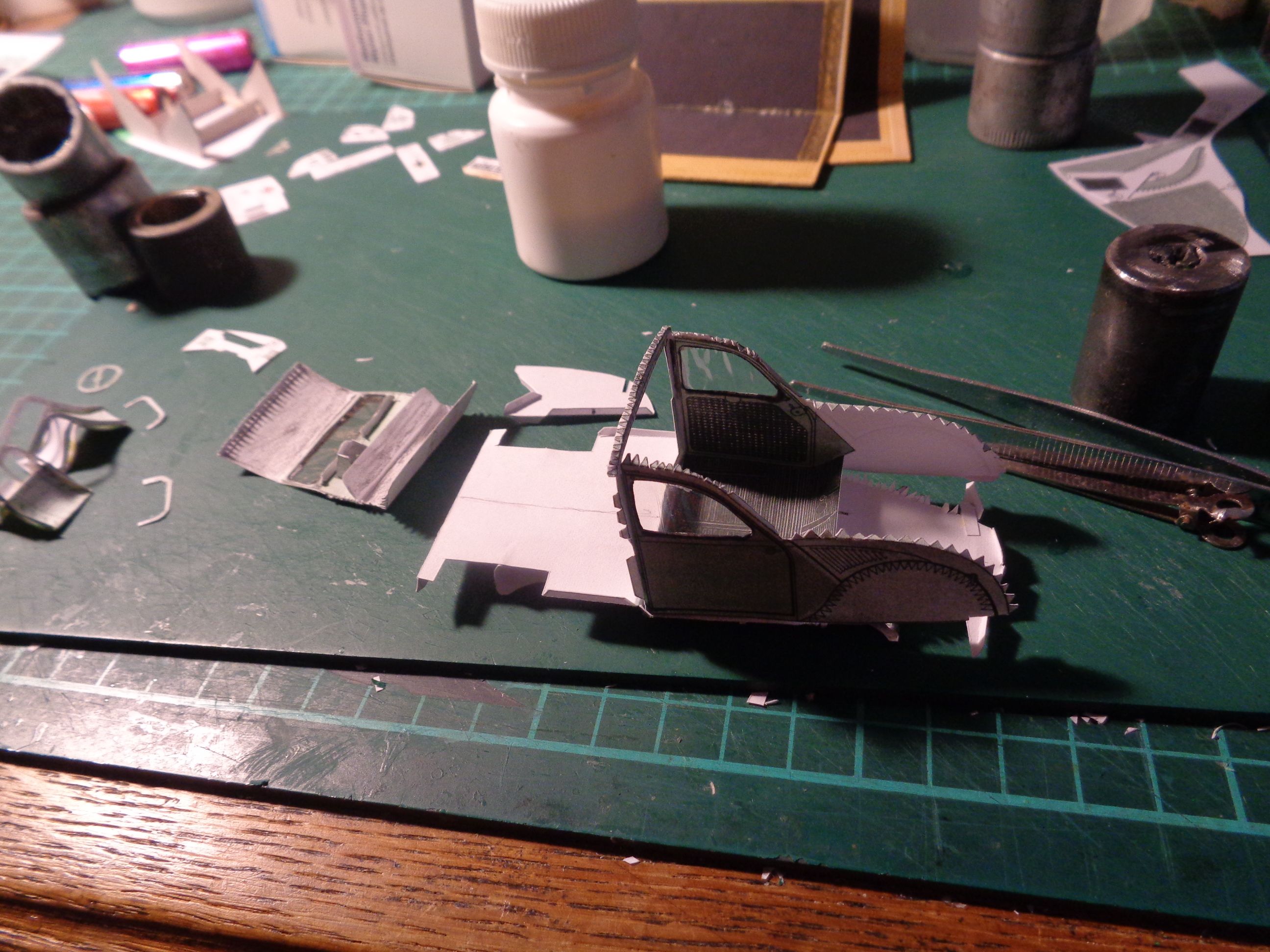 Bonjour. Voici la suite du montage de la 2CV camionnette d'après kit carton.