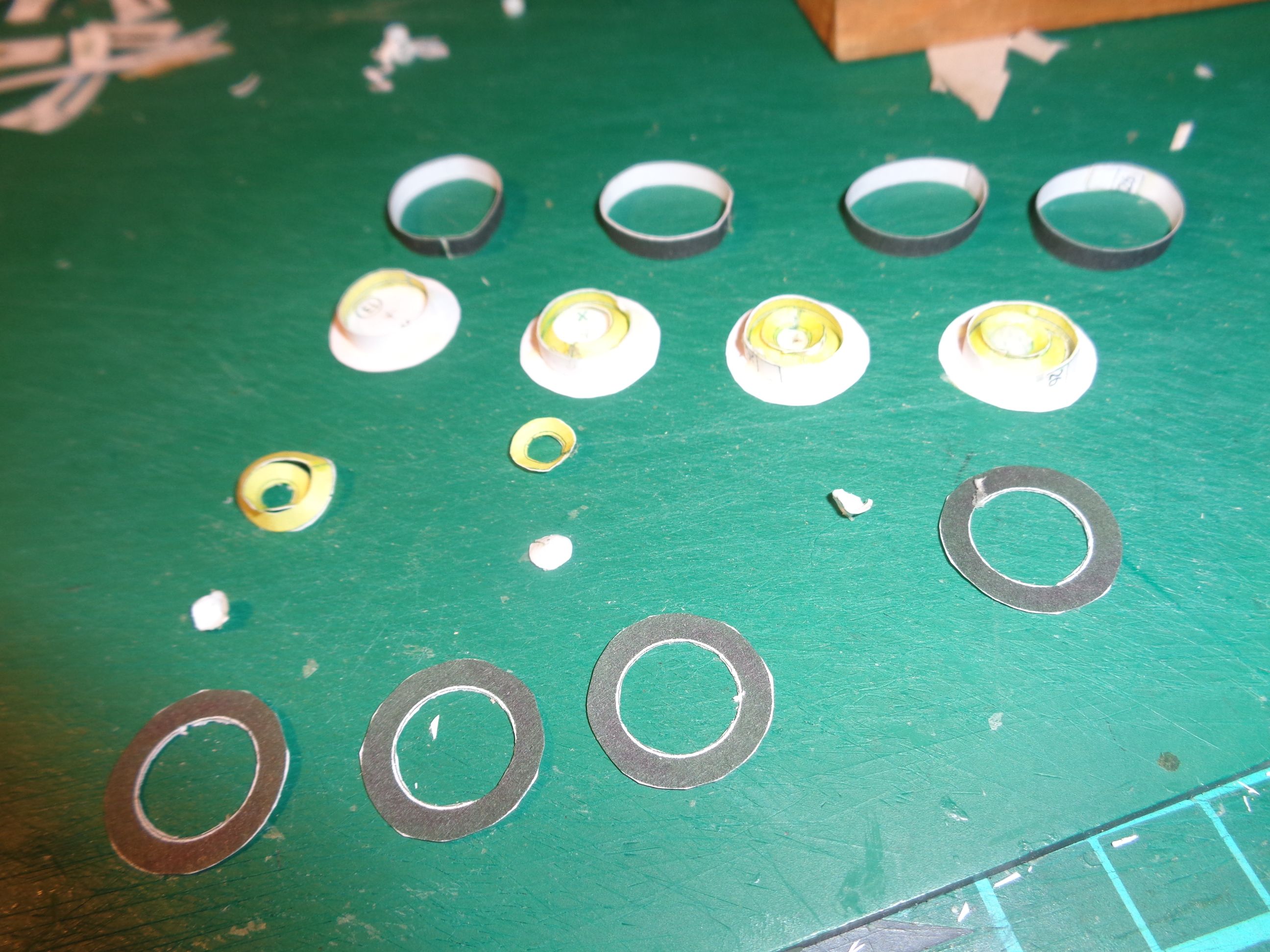 Toutes les pièces constitutives des roues sont là, les cerclages intérieurs et extérieurs (jaune à l'intérieur, noir à l'extérieur), les disques pleins (ceux qui sont en couleur) et évidés, les pièces de décoration des jantes et les mini languettes qui vont finir à la poubelle. Là j'ai fait un collage bord à bord. Pour avoir des cerclages à peu près ronds, je les roule avec une barre ronde (bois, métal, selon ce que j'ai sous la main) passée à l'intérieur.