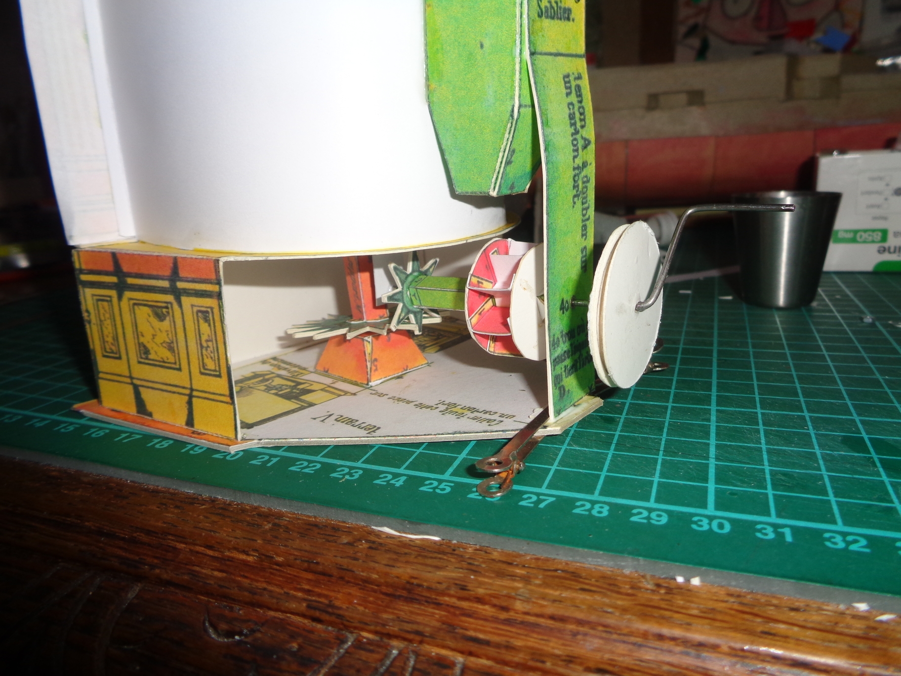 Voici le collage du décor, l'installation de la grande roue dentée (noter la petite rondelle), le réservoir est en place et le gobelet des fondus bourguignons est là parce qu'il fait juste la hauteur nécessaire pour caler pendant le séchage. Il y a beaucoup de jeu vertical, c'est normal (et nécessaire).