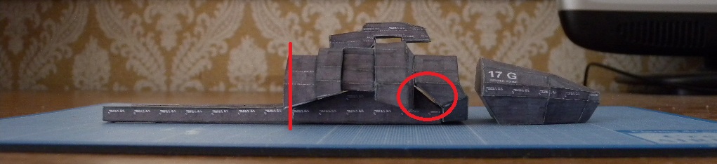J'arrive assez rapidement à quelques pièces me permettant de concrétiser un début de l'avant du vaisseau. A cause des nombreuses lignes de pliage, le feutre est à utiliser sans modération
