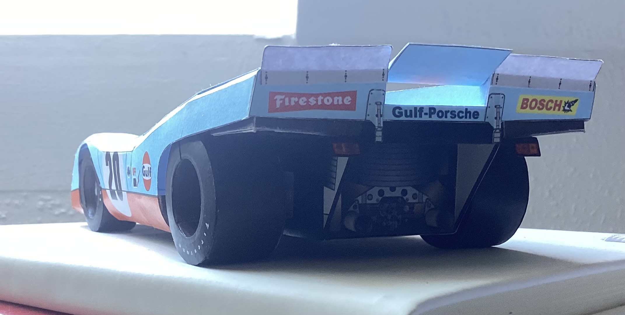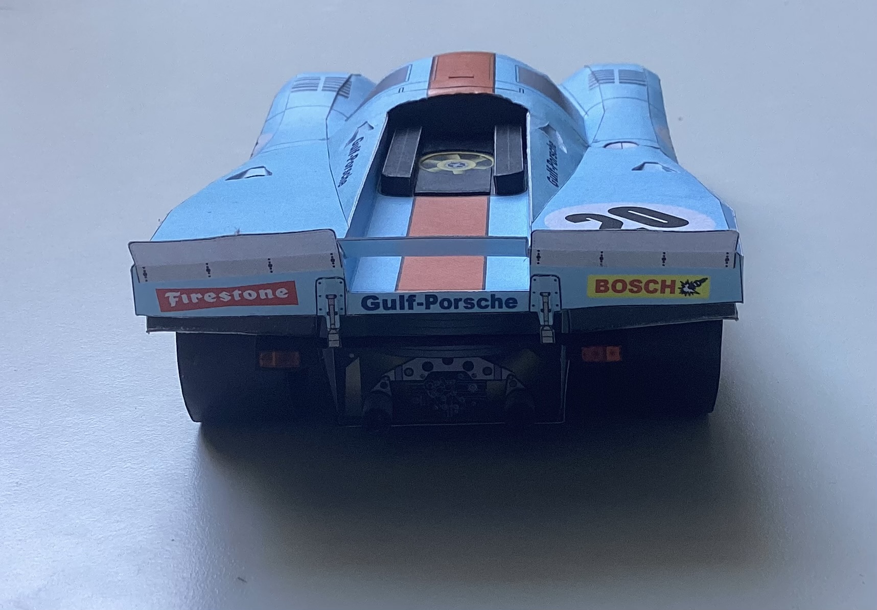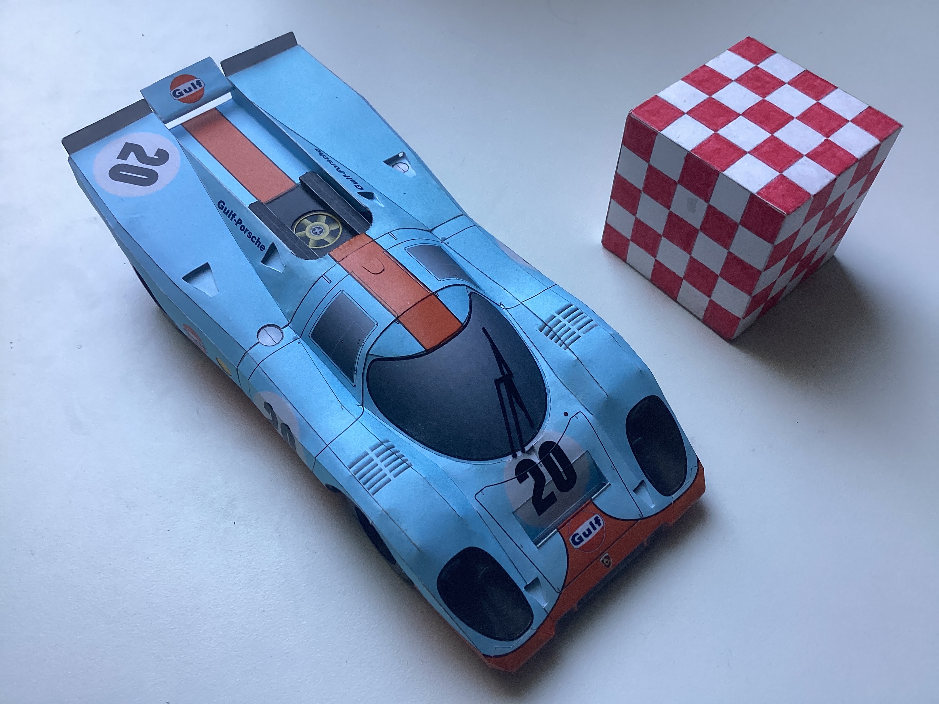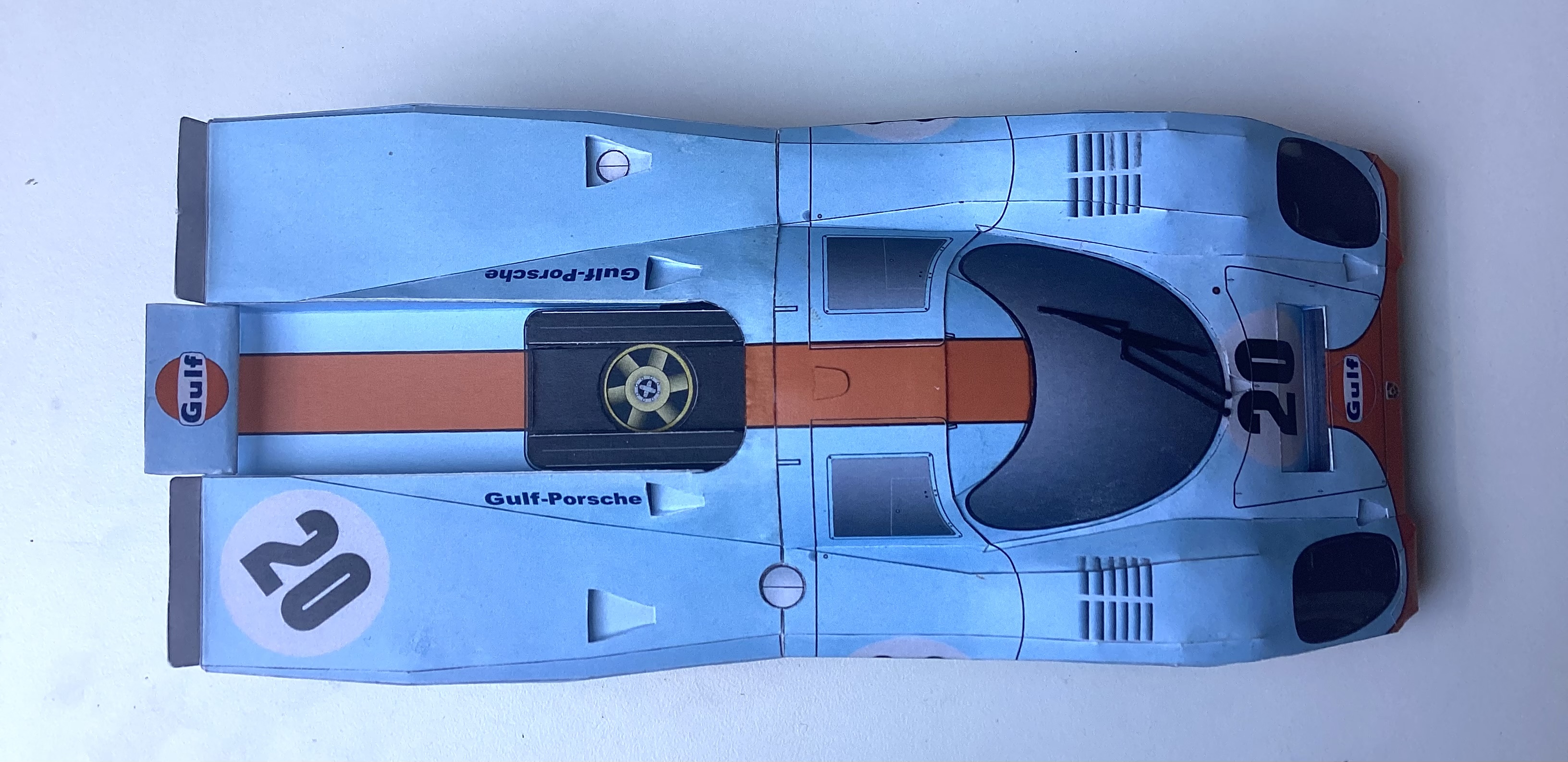 Porsche 917K de 1970, ech. 1/24. La livrée est celle de la voiture de Steve McQueen dans le film « Le Mans » (1971). La maquette provient de papersportscars.wz.cz.