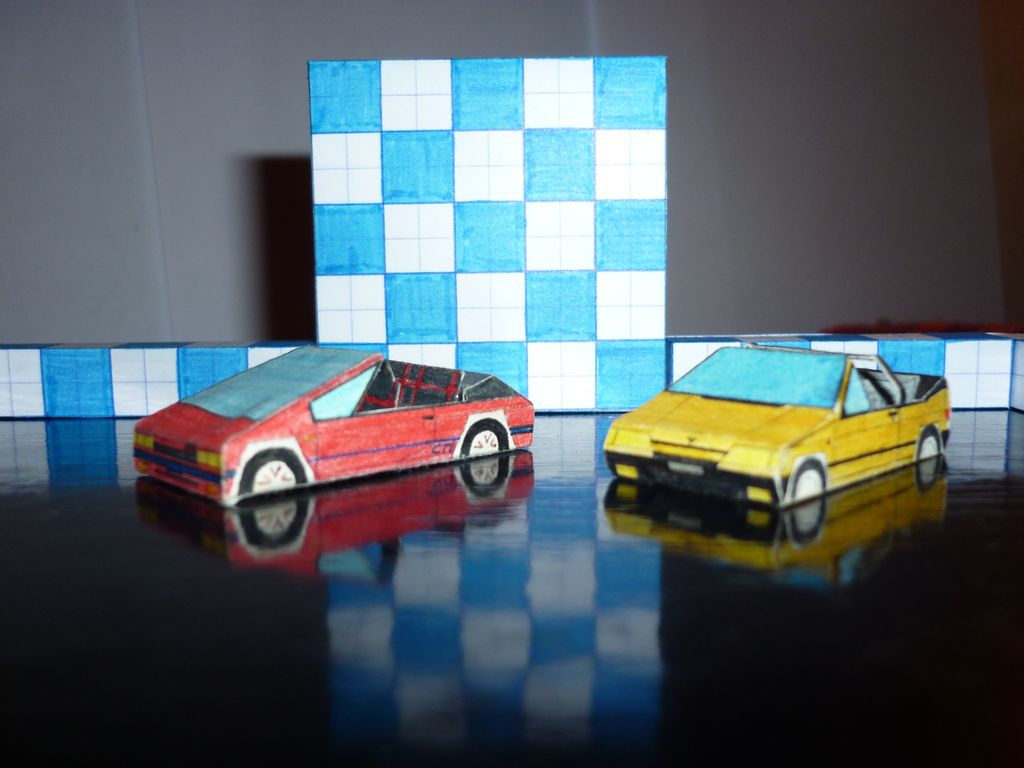 Toujours pas de roues complètes. Mes premiers cabriolets 100% faits mains (modèles persos). 4 cm x 2 cm pour la Pascal 1 CTI rouge (13/12/89), 3.8 cm x 2cm pour le proto d'Axia 2 cabrio jaune (03/10/90).