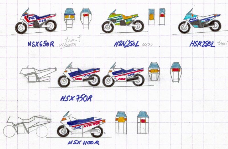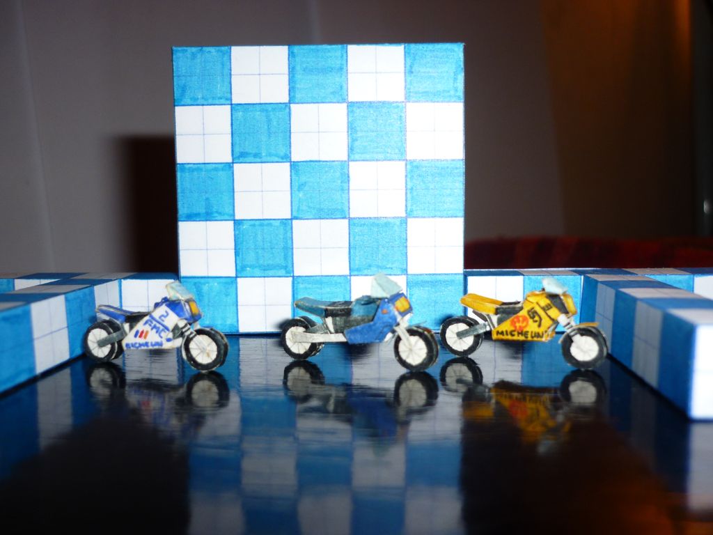 Eté 89. Je m'ennuyais un peu au Portugal et armé pour toute doc de quelques pubs découpées dans des journaux, j'ai fait les 3 seules motos de ma carrière de colleur de papier. Le carénage de celle du milieu (qui était le proto) n'est pas d'origine. Ces motos font 2,4 cm de long. Au moins, elles ont des roues complètes.