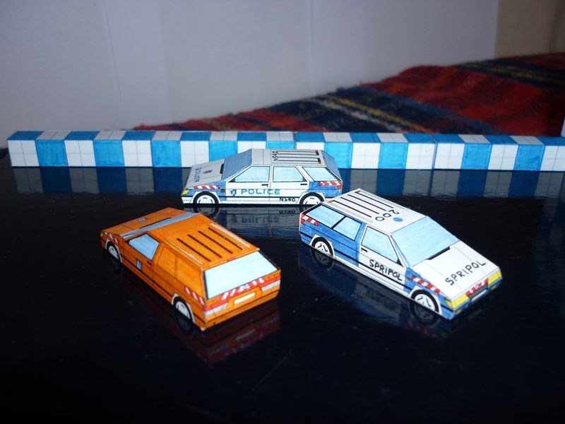 Quand j'ai refait ce modèle sous Inkscape en novembre dernier, j'ai ajouté des carosseries non prévues : 3 portes (pas encore montée), break 3 portes vitré et break 3 portes tôlé. Sur la photo ci-dessous figurent un break 5 portes de la police nationale de mon état fictif, un break trois portes d'une police autonome de ce même état et un break 3 portes tôlé de la DDE locale. Il manque la rampe sur celle de la PN.