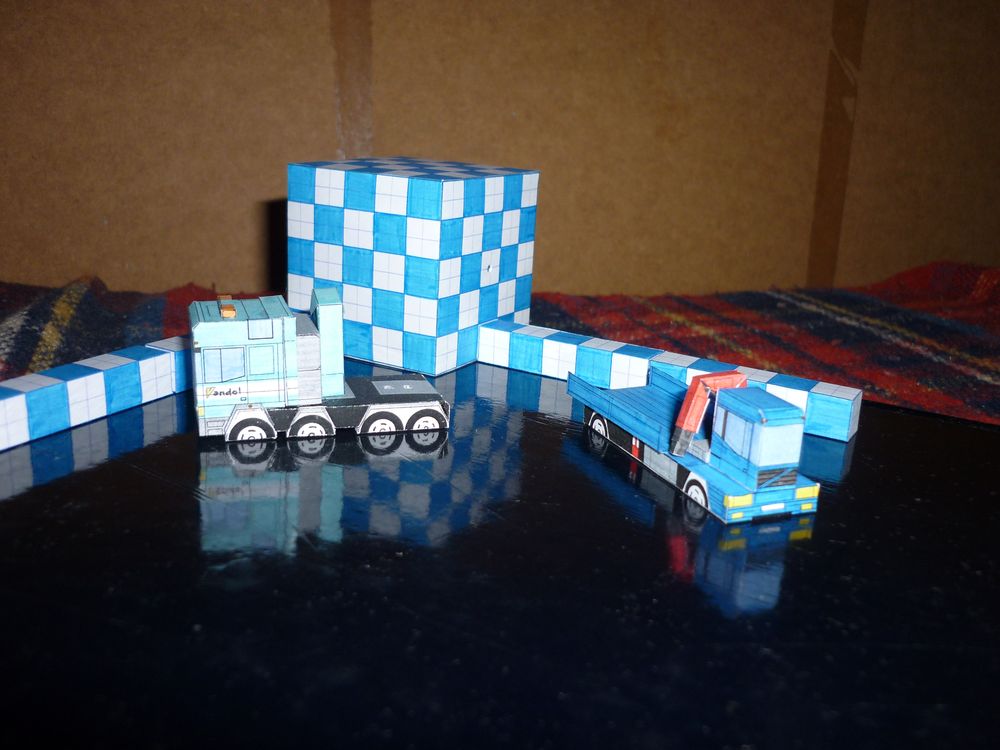 On passe maintenant aux modèles perso. J'ai commencé à faire des jouets en papiers vers l'âge de 9/10 ans et ils ont commencé à prendre un peu de volume quand j'avais 13 ans (ils étaient plutôt plats avant). Il s'agissait de remplacer les jouets que mes parents ne m'achetaient pas. Ils sont donc très simples, fait pour être dessinés rapidement sur du papier quadrillé et construits tout aussi vite. J'évitais les surfaces courbes et mes voitures, camions et bus n'avaient pas de roues complètes (et n'en ont toujours pas). Je crois bien que ma première doc a été le catalogue des miniatures Siku de 1985.