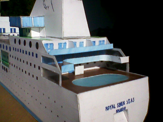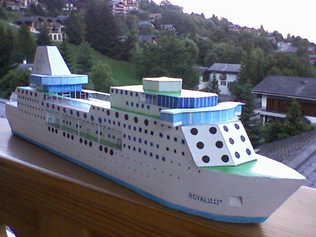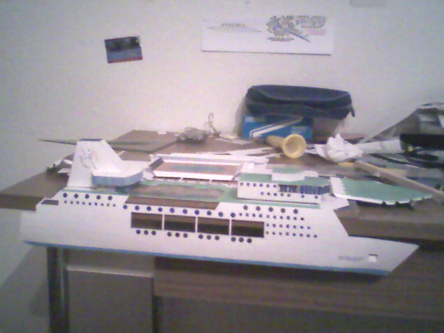 Toutes les rembardes sont déjà en place, bien comme les tuyaux d'échappement de la cheminée, et le drapeau faux que j'ai noté la réponse antérieure est remplacé par celui de Finlande (lieu de construction choisi). Aussi des chaises-longues ont été ajoutées pour que les ponts ne semblent trop vides.