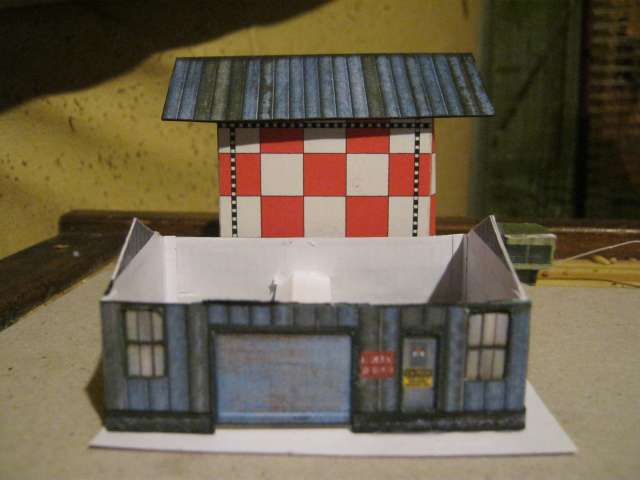 Retrait de l'appendice placé par erreur sur le côté et mise en place d'un petit baraquement en tôle (celui prévu par Clever) Le toit à reçu les écrans noirs qui permettront, d'une part de bloquer la toiture pour quelle ne tombe pas et d'autre part de filtre la lumière. Le modèle à reçu une rampe permettant d'accéder à la porte (j'ai encore trop de problèmes avec les escaliers à cette échelle)