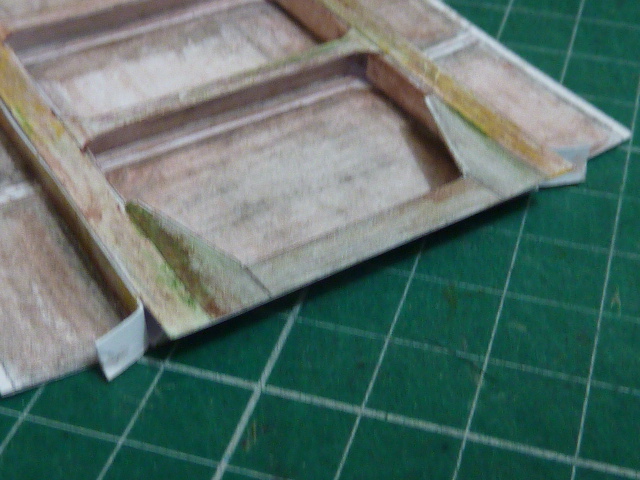 Je pensais à la texture extérieure, car la feuille en métal qui recouvre le camion est texturée. Dans cette échelle on peut penser à choses détaillés, donc j'ai pris un carton 150g et l'ai marqué le verso avec un stylo de pointe arrondie. Ça a rendu un très bon résultat.
