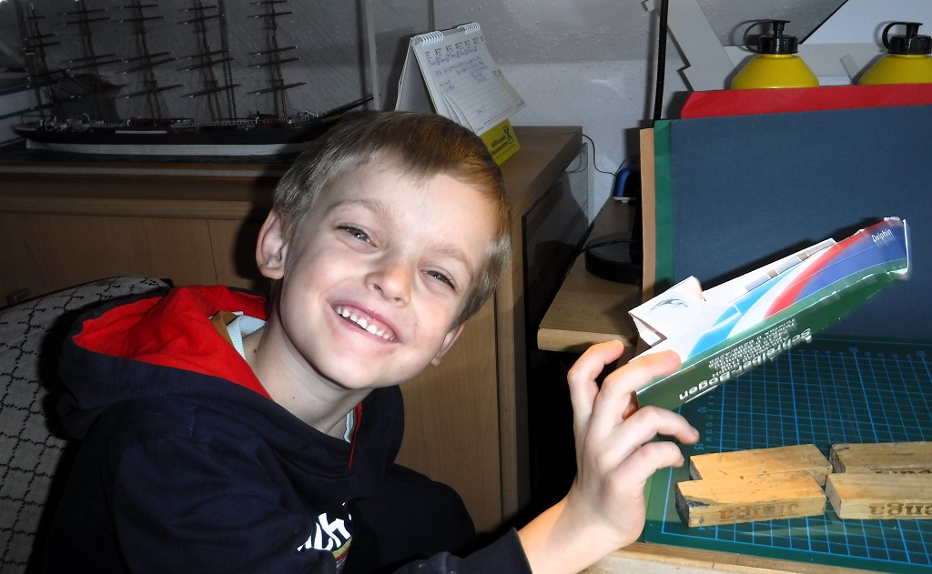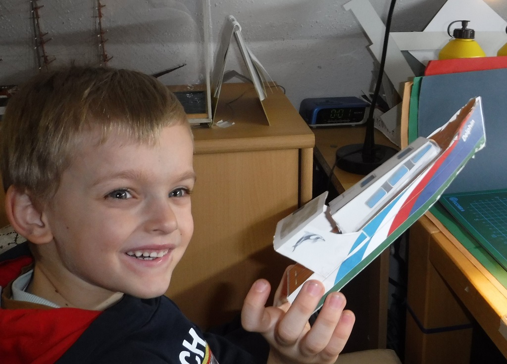 Avec le bateau à moteur de Schreiber, je lui ai donné :rolleyes: la possibilité de construire tout seul son premier modèle :rolleyes:. Comme il n'a que cinq ans, j'étais un peu sceptique mais Matthias m'a vraiment surpris. :Pouce en l'air: