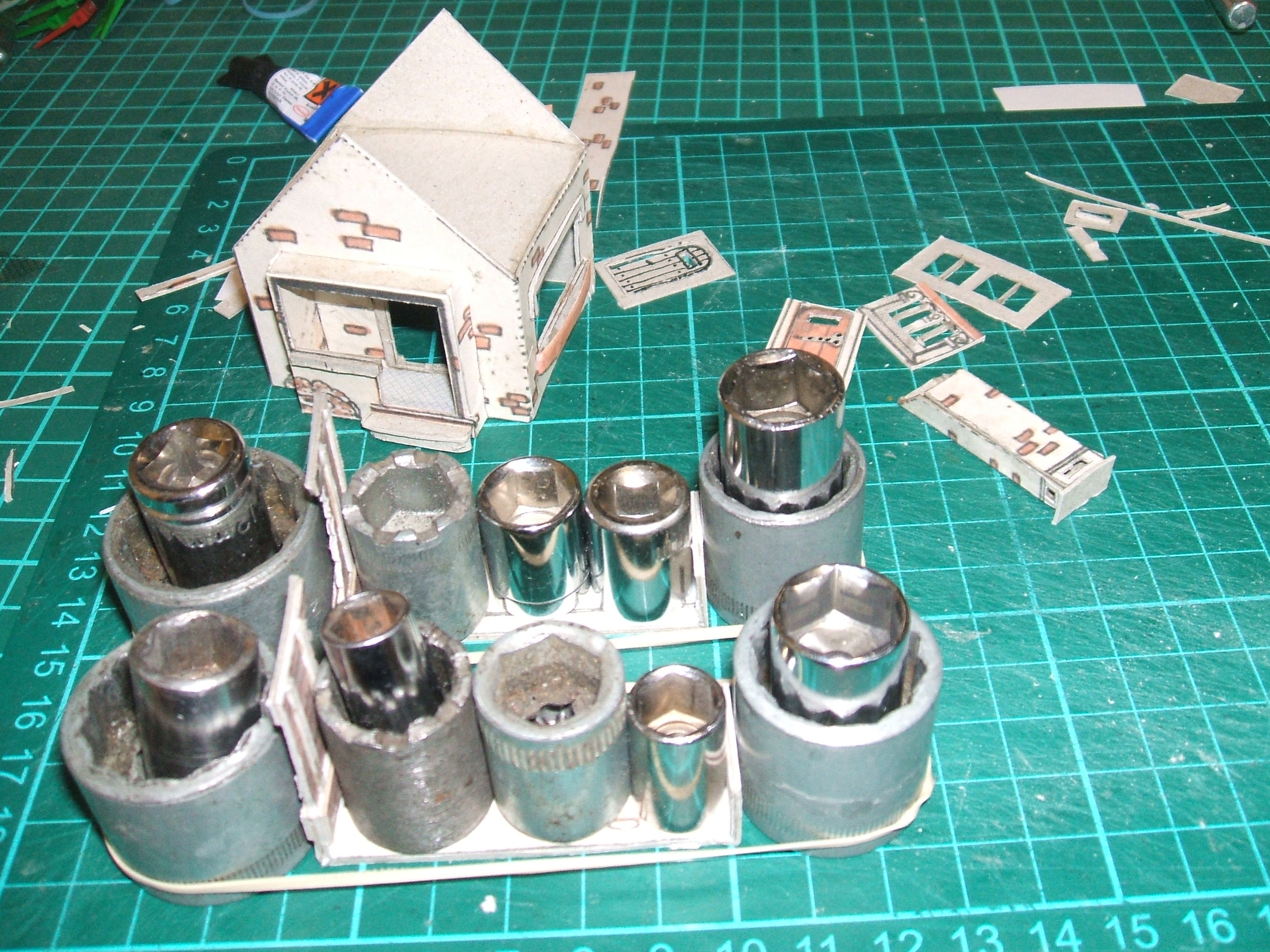 Le détail de la table et des chaises. Je ne connais même pas les dimensions, c'est taillé à l'instinct. Vous pouvez facilement les déduire ; les carrés de mon tapis de découpe font 1cm de côté. la table et les chaises pliées et les pièces de l'auvent découpées Et voici le collage bord à bord pour la citerne. Le carton est découpé, trempé dans l'eau et devient bien mou. On met un peu de plastique alimentaire autour du moyeu en carton (piquet de croquet de récupération) , on encolle abondamment le carton mou et mouillé, on le met sur son mandrin et on serre avec des élastiques ; alors on attend au moins une nuit