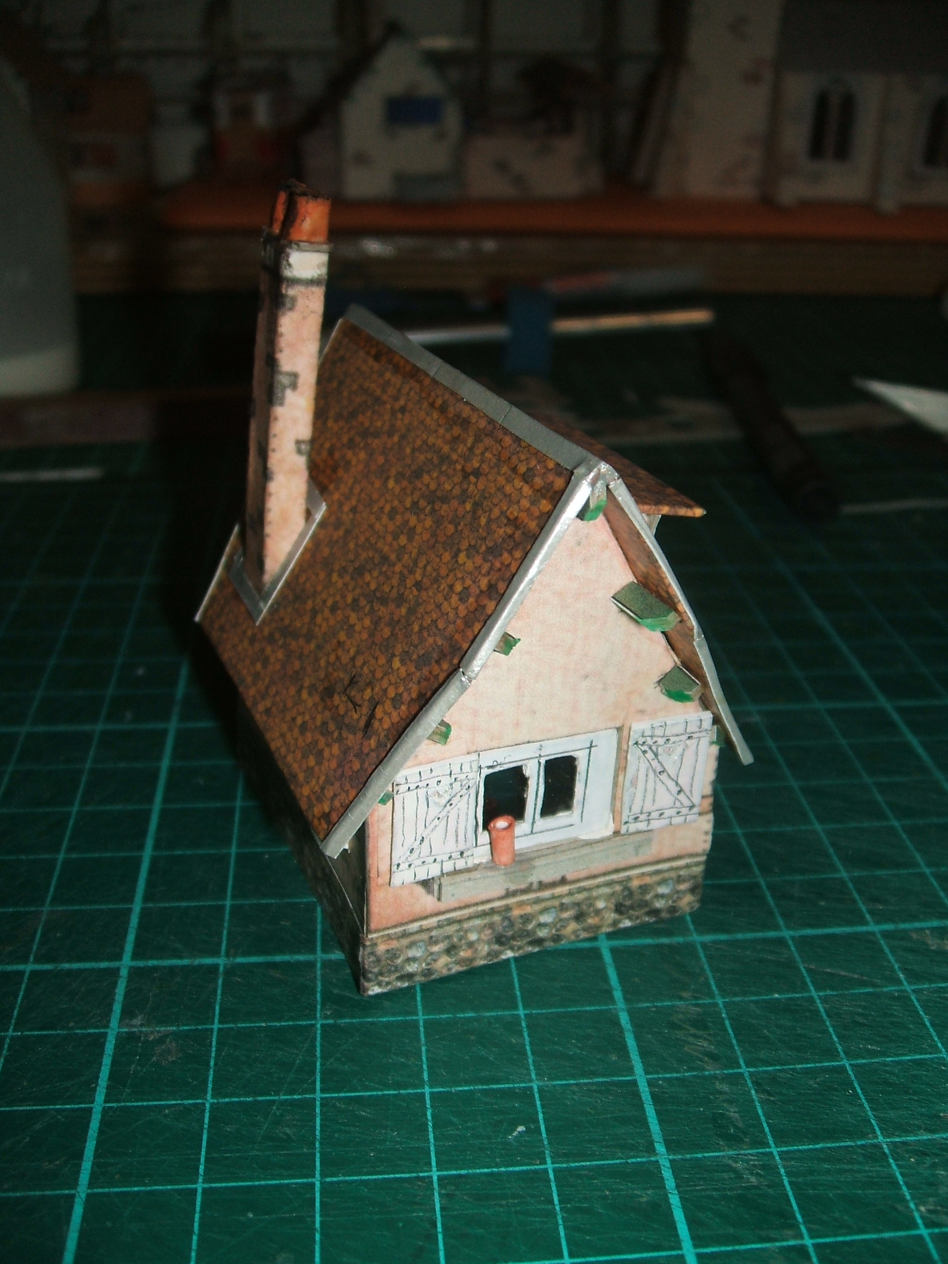 Noter le chapeau de cheminée à gauche (deux tubes) La maison vue de l'arrière. Voir le pied de cheminée et les zingueries autour du toit. C'est normal pour ce type de tuiles le côté fenêtre normande Voilà. Ce n'est pas compliqué mais pas si facile quand même. Le papier argent Canson éprouve les humeurs quand on le colle sur les bords d'un toit pas droit à la colle qui ne sèche pas très vite. Par contre, à cet endroit, je suis presque sur que c'est le doigt qui serait collé à la place du petit bout de papier,avec l'inévitable sacrifice du morceau de toit agresseur.