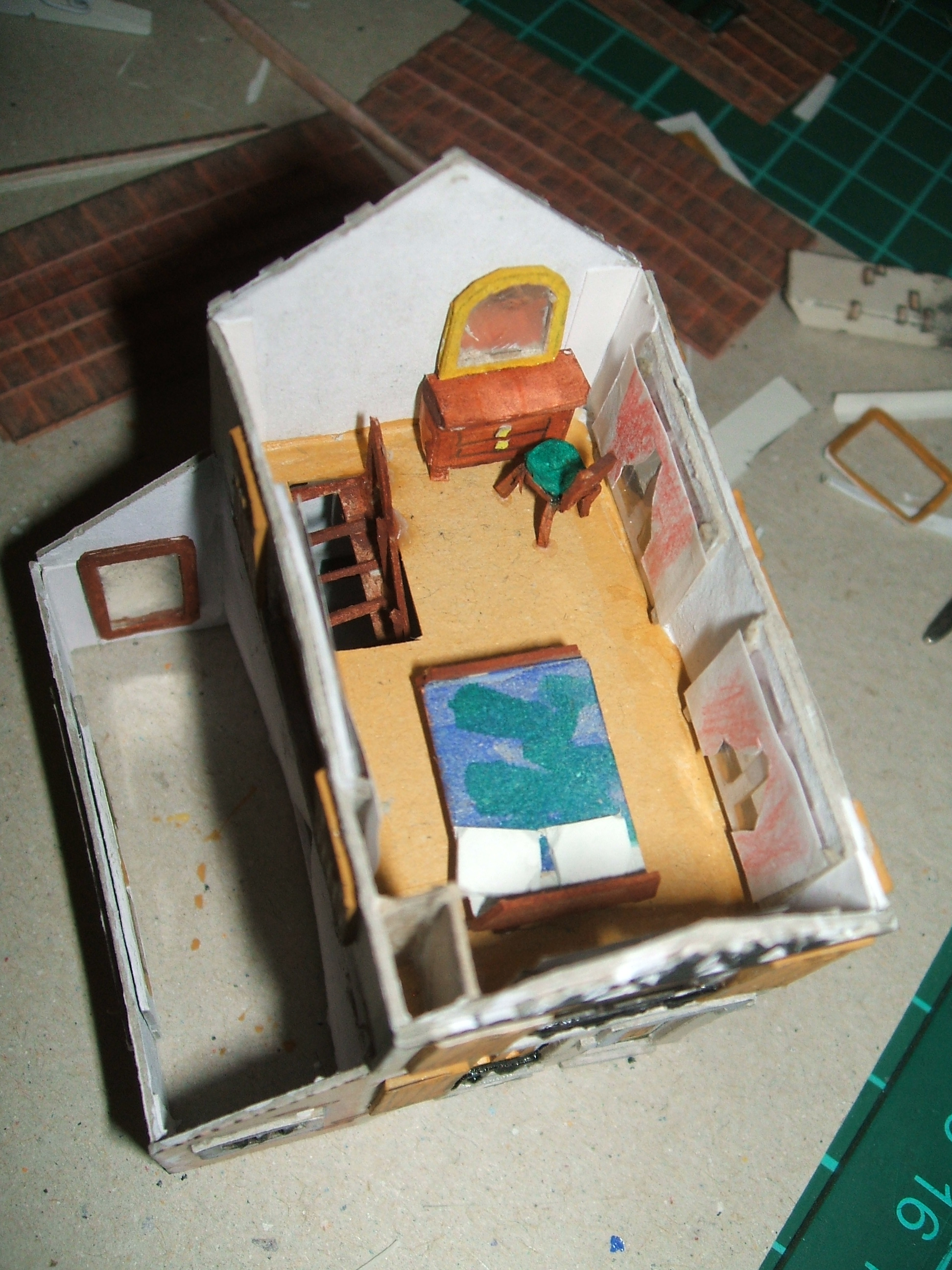 La maison et ses accessoires, huisseries avec vitrages, tuiles faîtières, un peu d'ameublement, les volets, le tonneau de récupération d'eau, la cheminée. Le truc bizarre en haut à gauche et dans l'ombre est un morceau de mousse dans lequel je plante petits forets et épingles à usage immédiat. Je ne les perd pas. l'ameublement. Une commode avec glace, un lit avec deux oreillers, une chaise avec un coussin vert.Pour la chaise, replier ce qui doit l'être et mettre un peu de cyanoacrylate liquide dans l'angle sans vous coller les doigts. Ça solidifie les pliages. le début du montage des huisseries (porte et grille de la petite fenêtre) à suivre