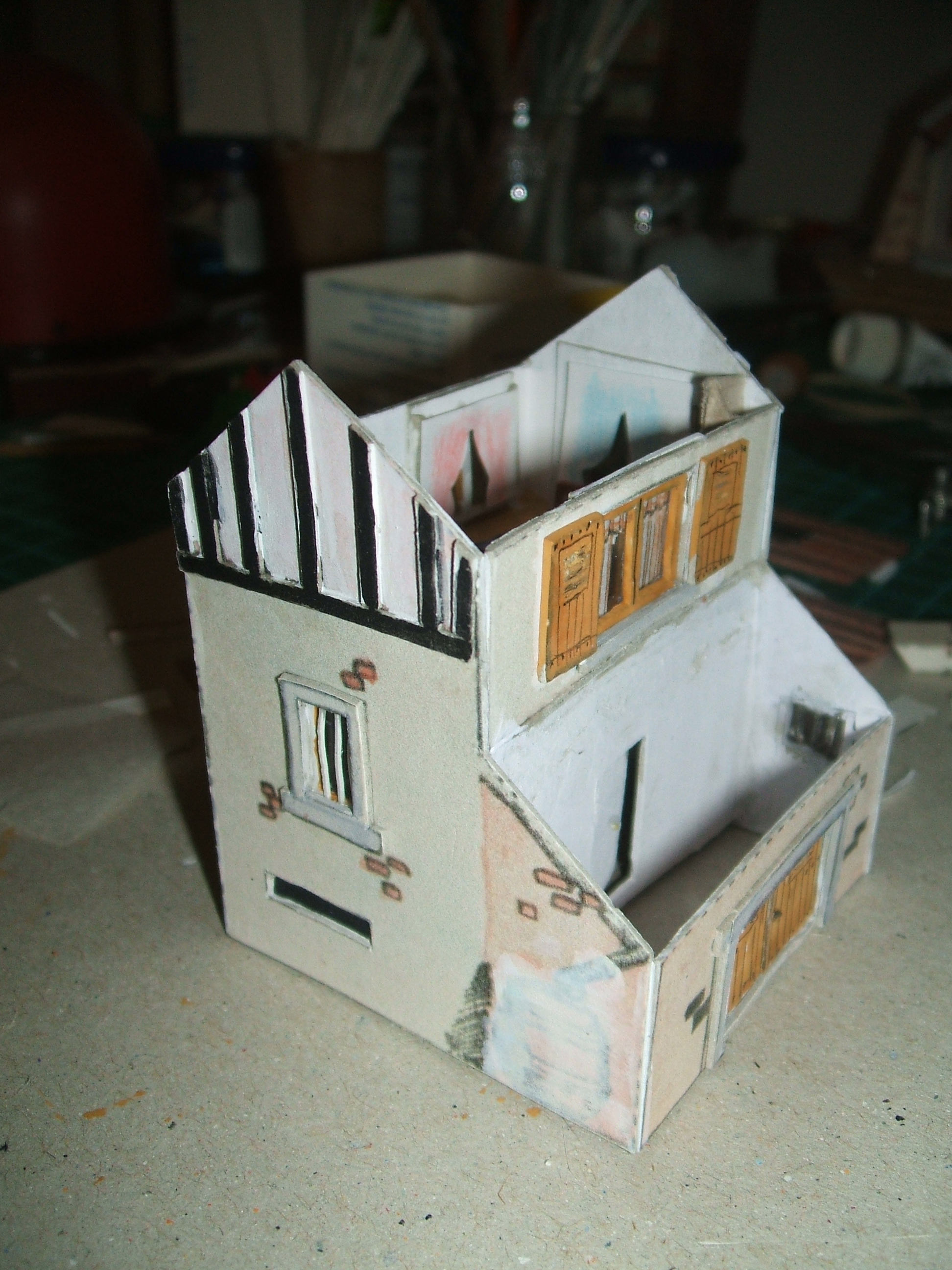 façade avec volets et fenêtres. Les rideaux sont teintés au crayon de couleur au revers. l'autre côté avec le conduit de fumée qui pointe son nez les fenêtres et leur décor fer forgé La fenêtre haute à gauche de la porte est celle de la salle de bains et des toilettes; il y a un morceau de papier japon translucide derrière.